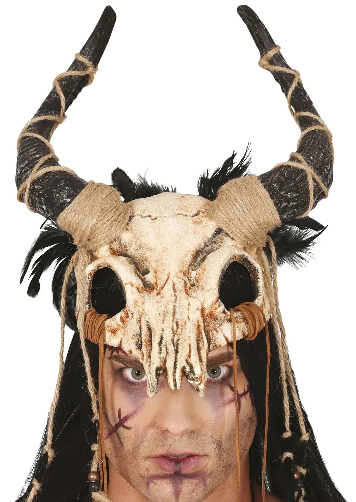 Stai cercando una maschera di teschio animale per il tuo costume? Con la maschera di teschio animale con corna decorate con corde e piume avrai l’accessorio perfetto per una grande varietà di costumi come stregone satanico, sciamano cavernicolo o stregone voodoo e trionferai alla tua festa di costumi o Halloween.