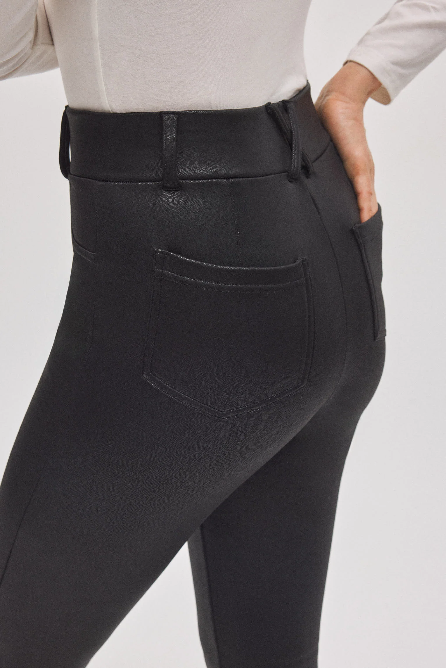 Pantaloni termici effetto pelle con elastico in vita e passanti per cintura, uno stile più strutturato con dettagli decorativi.