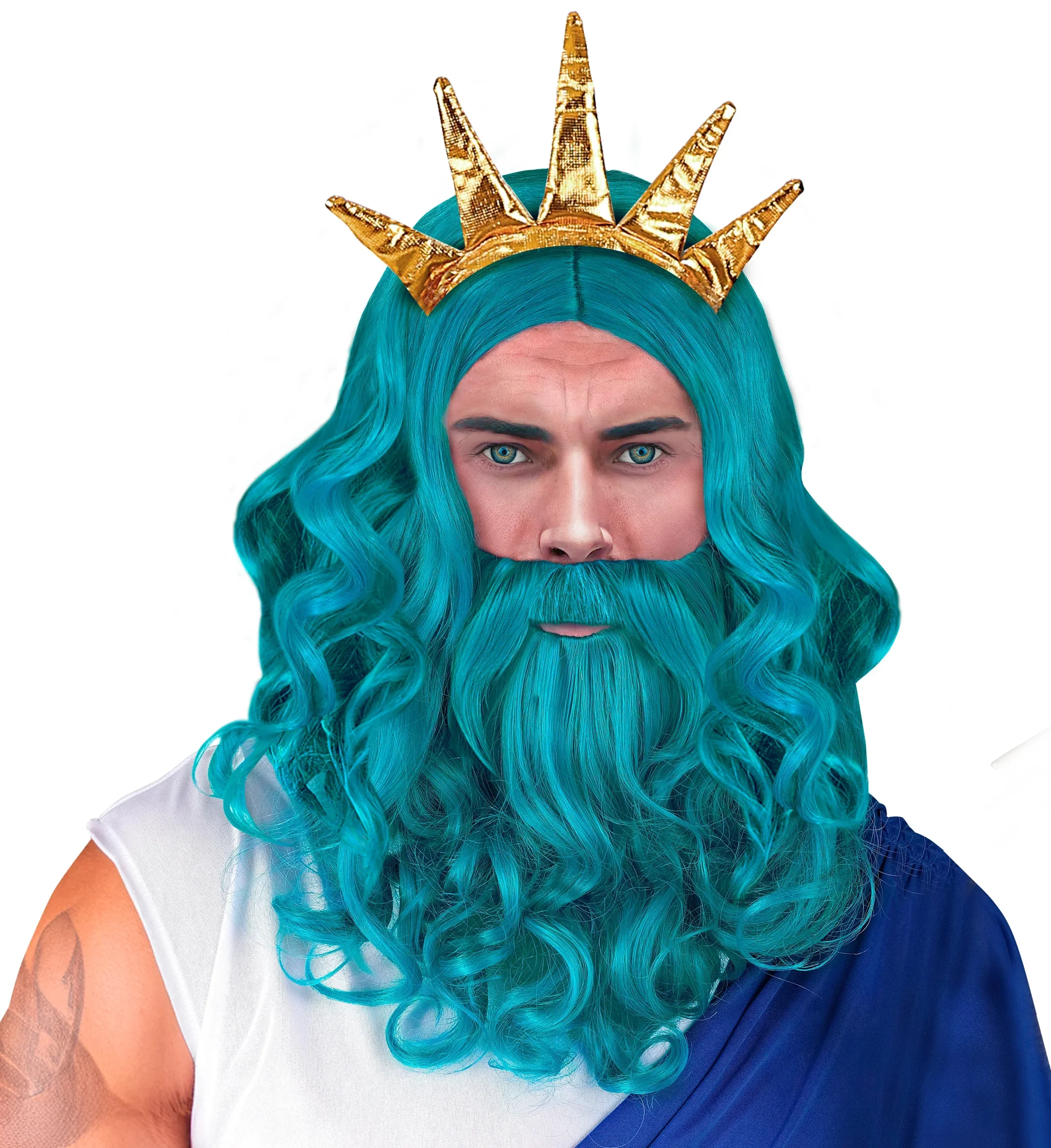 Stai cercando una parrucca con barba per il costume di Nettuno o Poseidone? Con la parrucca blu turchese con barba avrai il complemento perfetto per travestirti come il dio dei mari della mitologia romana e greca e trionferai alla tua festa in maschera.