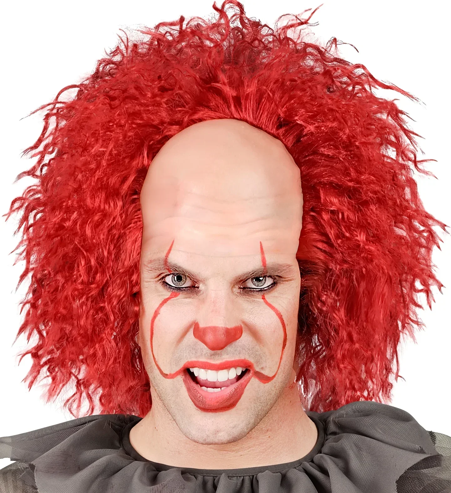 Stai cercando una parrucca per il tuo costume da pagliaccio diabolico? Con la parrucca rossa con calvizie di Pennywise avrai il complemento perfetto per travestirti come questo malvagio pagliaccio demoniaco dei film horror di “IT” e trionferai alla tua festa di Halloween.