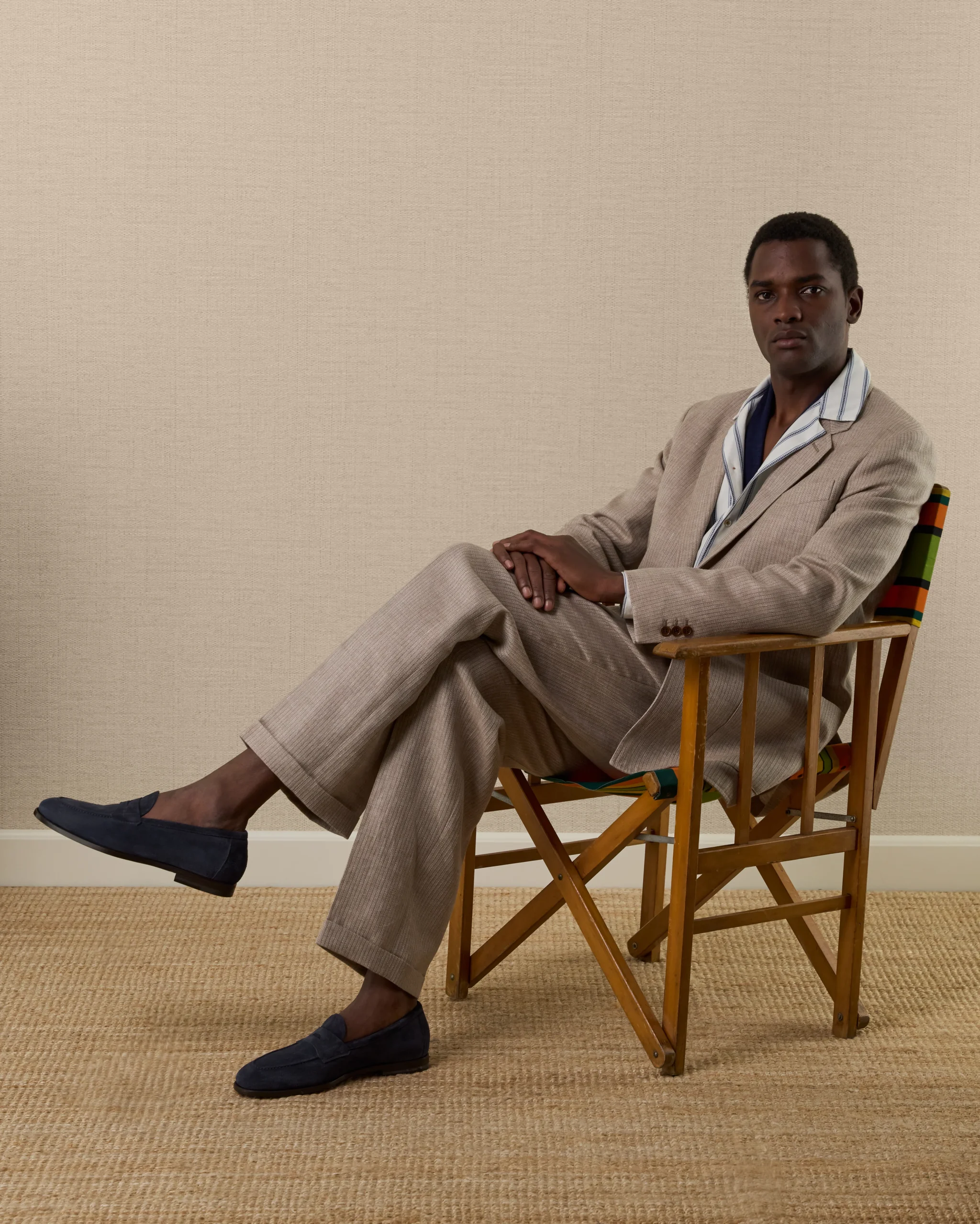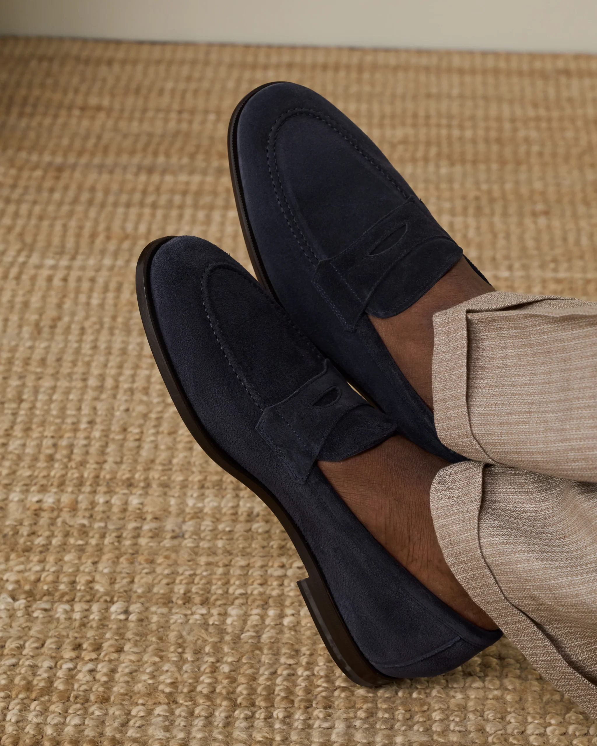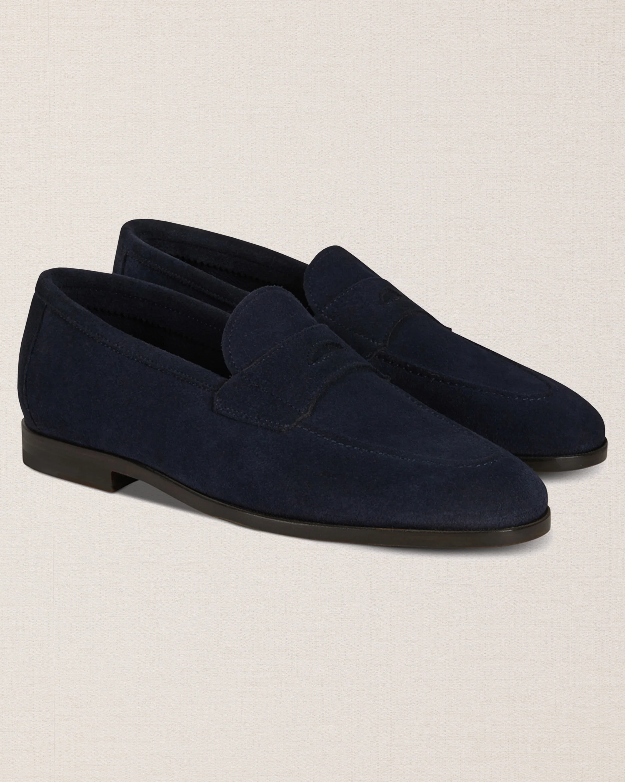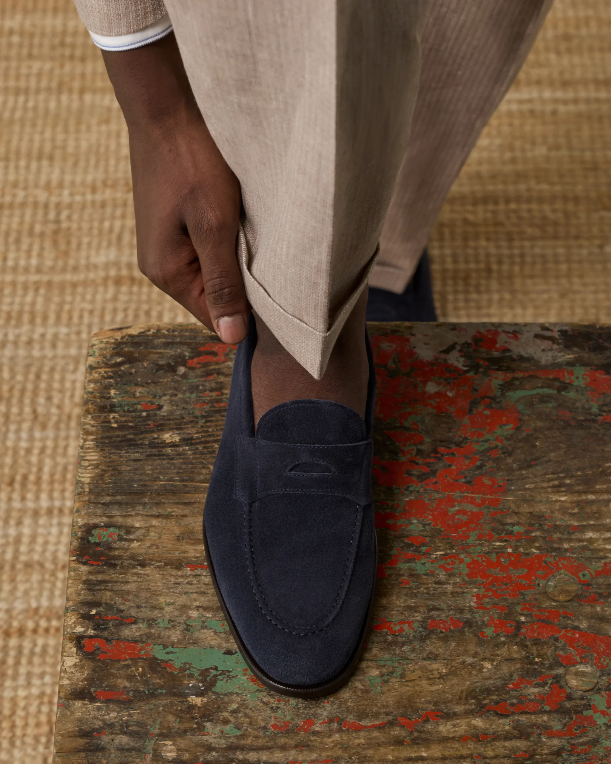Il College con mascherina, che si allunga verso la punta affusolata in morbida pelle di vitello scamosciata. Gli interni sfoderati accolgono il piede senza bisogno di calze. La suola è la classica in cuoio. Puoi abbinare il mocassino blu con un blazer sfoderato in cotone e lino color panna, camicia e jeans. C’è aria di mare là fuori, panama sul capo per goderti una passeggiata sotto il tiepido sole che va calando.