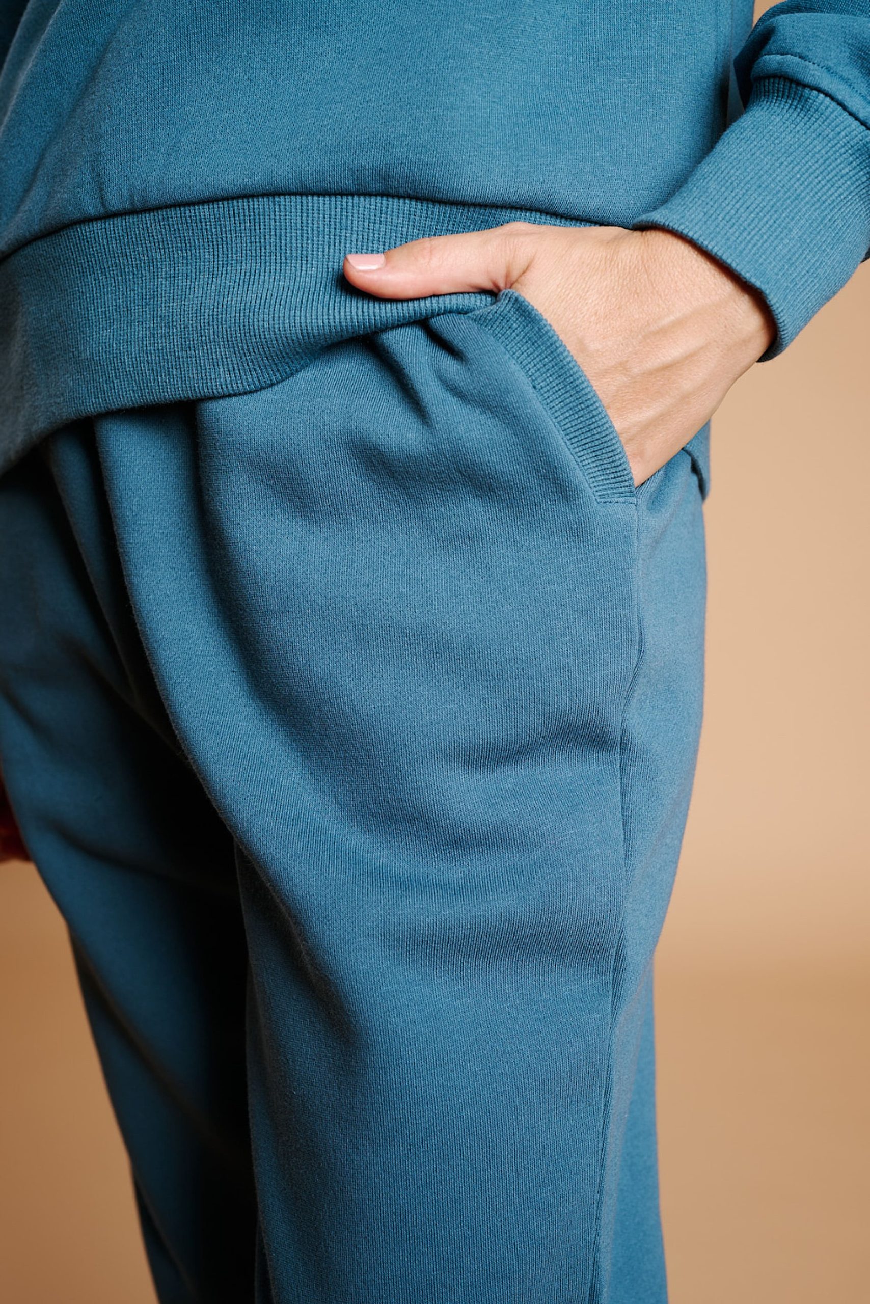 Completo da donna composto da felpa a maniche lunghe e pantaloni lunghi abbinati. Realizzato in tessuto morbido e piacevole al tatto, è perfetto per rilassarsi in casa con un look comodo e versatile. Il suo stile essenziale e moderno permette di indossarlo sia come pigiama che come completo homewear per tutti i giorni.