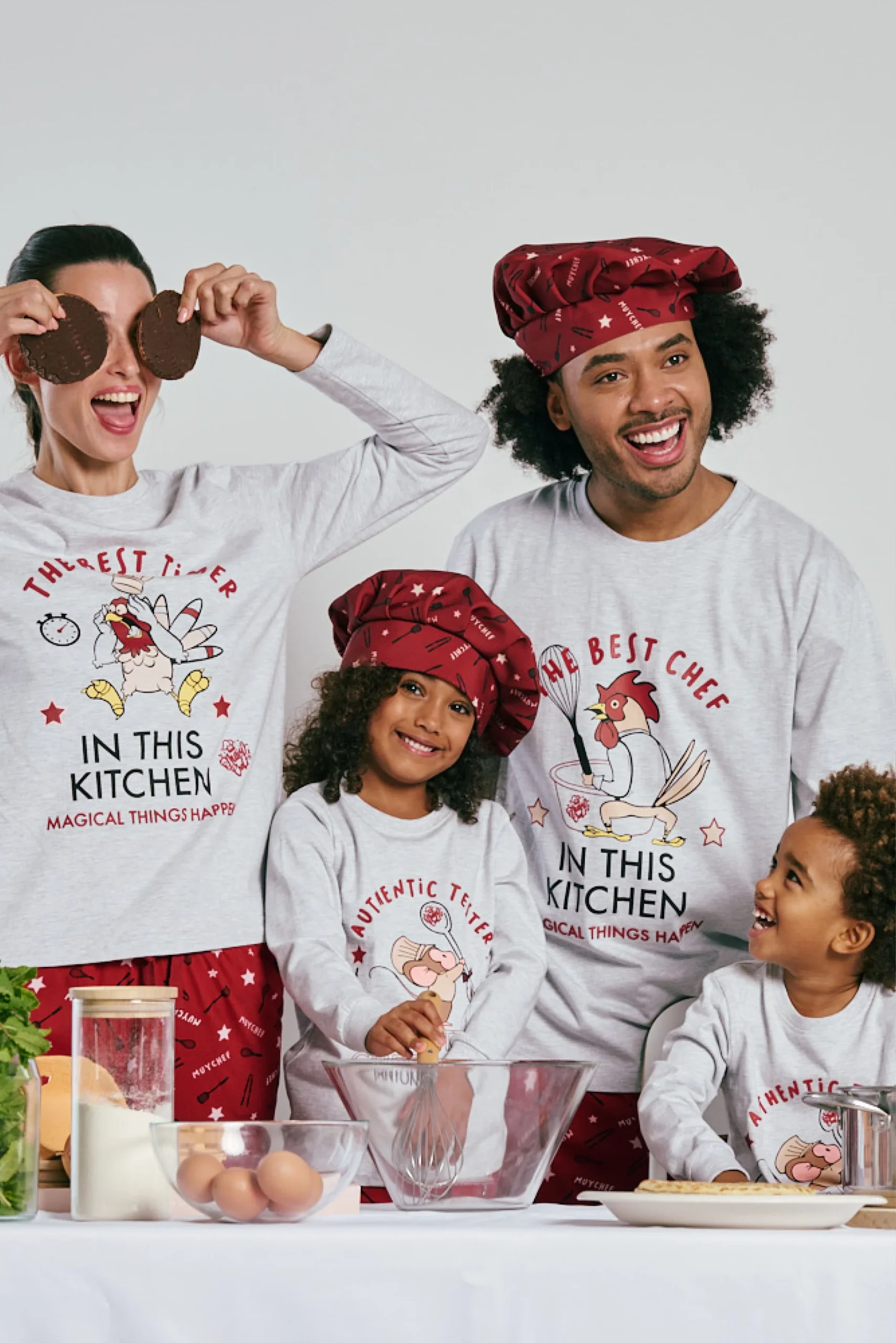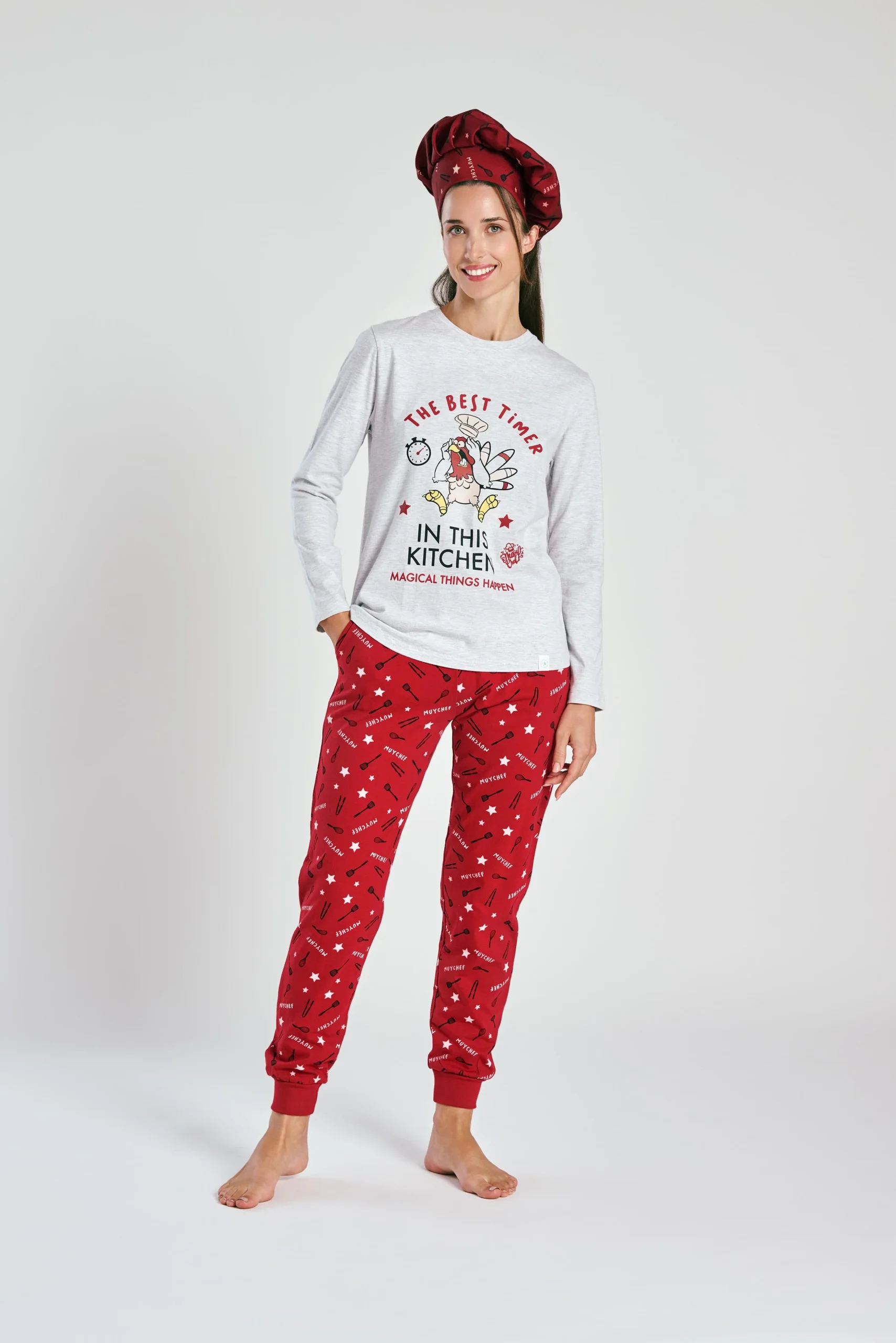 Questo pigiama invernale si distingue per il suo design divertente e accogliente. La maglia grigia a maniche lunghe presenta una stampa frontale ispirata alla cucina, con illustrazioni di utensili e frasi che evocano momenti caldi e familiari. I pantaloni rossi, con una stampa di cucchiai, stelle ed elementi culinari, sono realizzati in tessuto morbido e caldo, ideale per rilassarsi in casa con un tocco allegro e tematico.