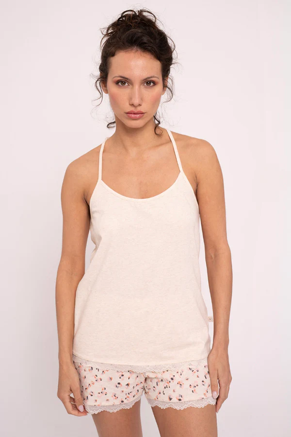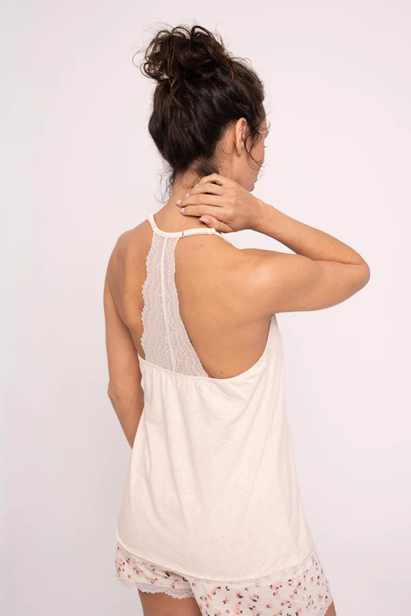 Pigiama composto da canotta in tinta unita e pantaloncini stampati rosa pallido. Entrambi i pezzi hanno dettagli in pizzo e la parte superiore ha la schiena scoperta con un ulteriore tocco di pizzo. I pantaloni hanno lacci regolabili.