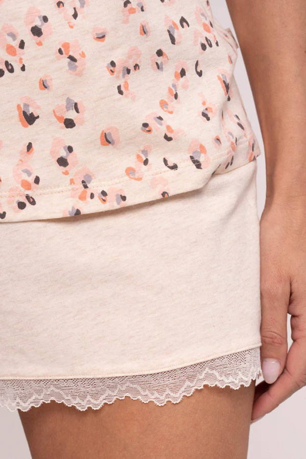 Pigiama composto da canotta con stampa astratta e pantaloncini rosa pallido. Entrambi presentano dettagli in pizzo e i pantaloni includono lacci regolabili per una vestibilità perfetta.