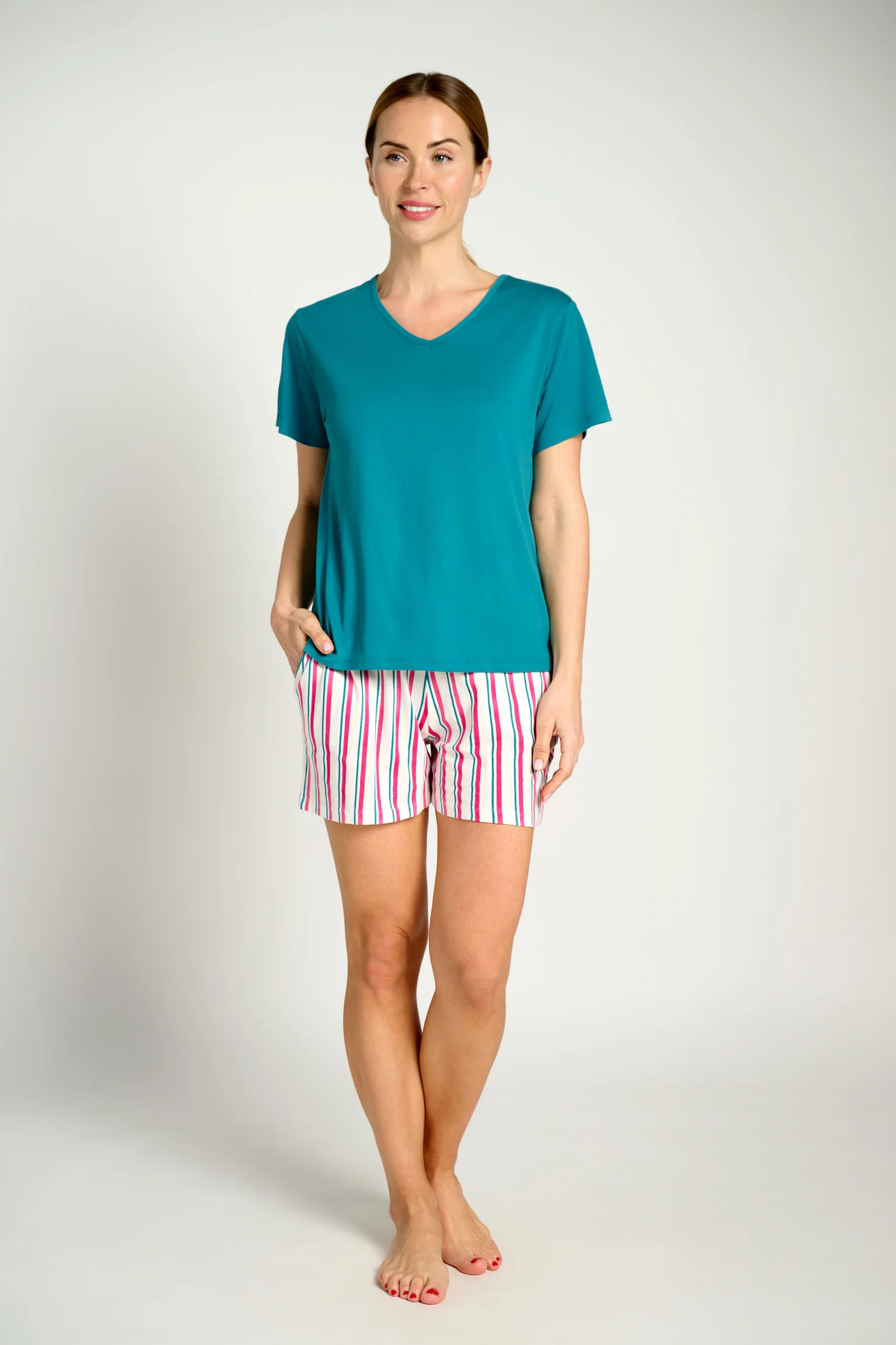 Conjunto de pijama para mujer mujer compuesto por una camiseta de manga corta azul y un short a rayas. Confeccionado con 100% algodón, perfecto para las noches cálidas de verano.