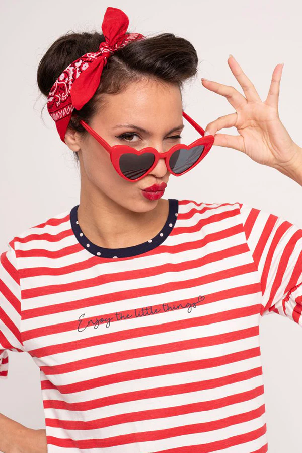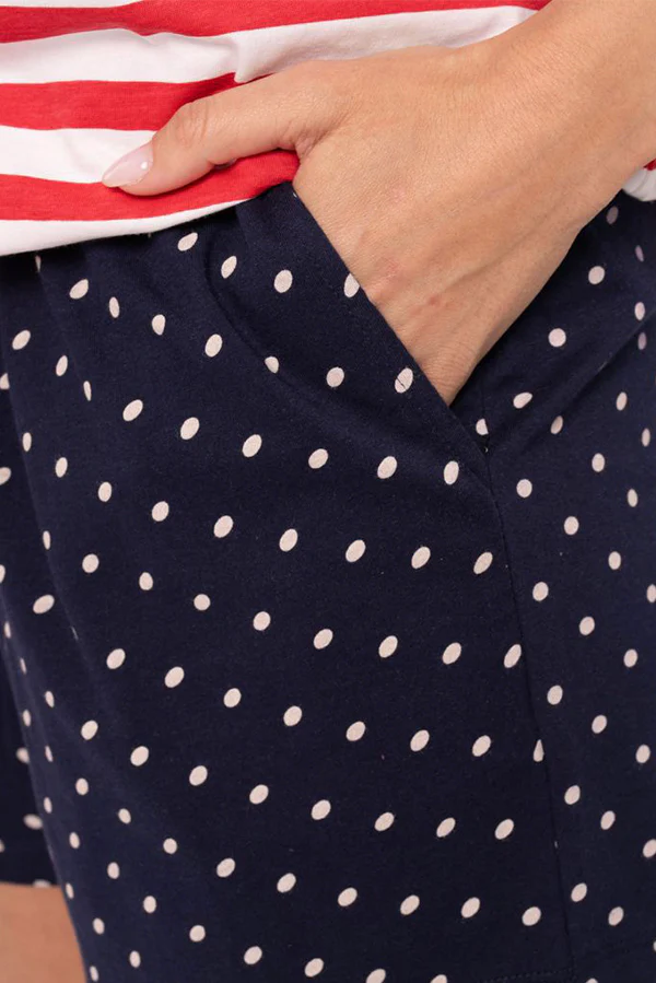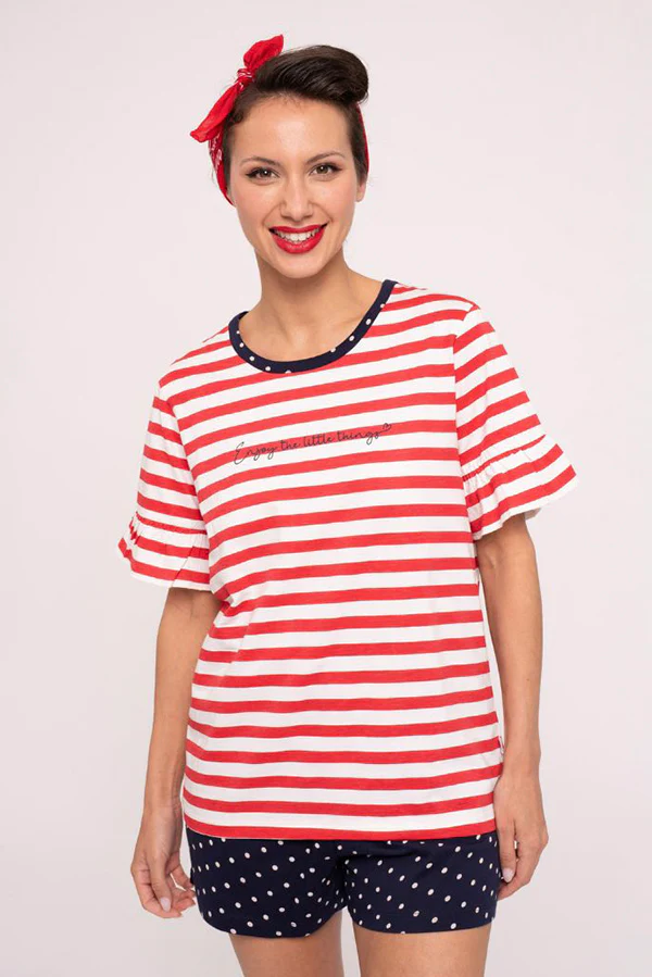 Pigiama composto da maglietta a maniche corte a righe rosse e pantaloncini blu scuro a pois bianchi. La t-shirt ha volant sulle maniche e i pantaloni includono tasche integrate e lacci regolabili.