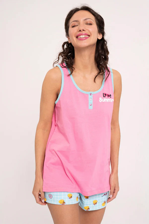 Set pigiama composto da canotta rosa e pantaloncini stampati con una divertente stampa di papere. I pantaloni sono dotati di lacci regolabili per un maggiore comfort e il set è perfetto per un look rilassato e affascinante.