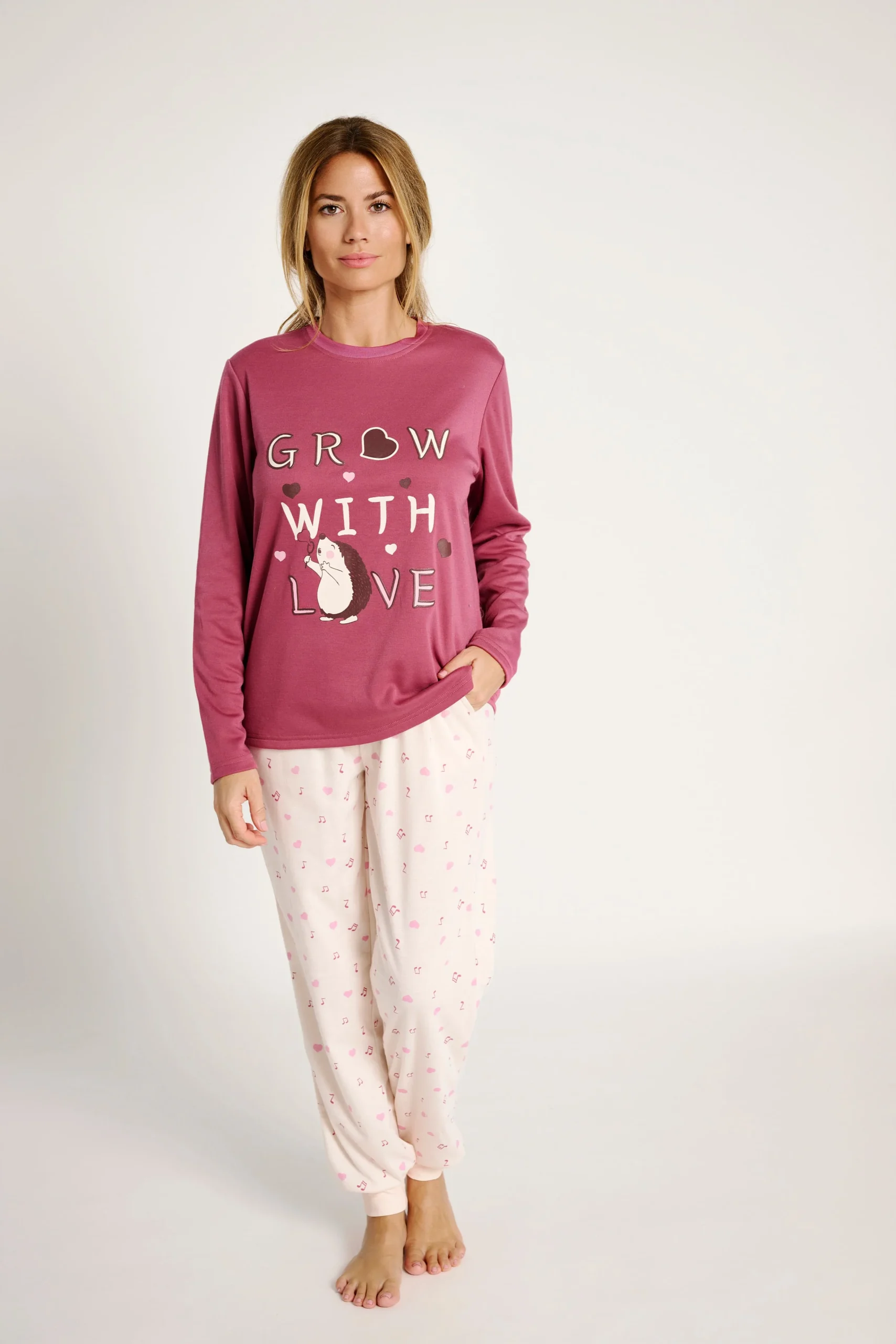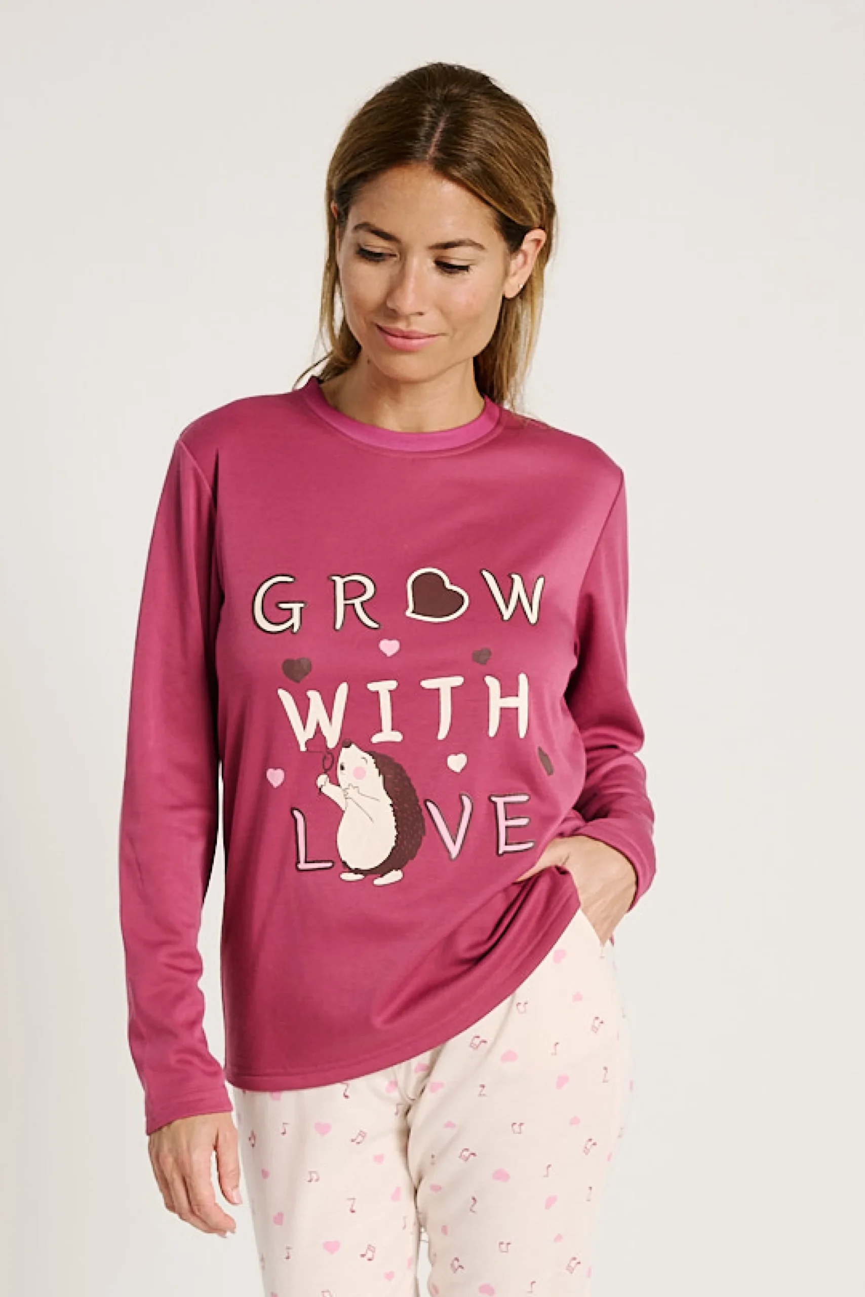 Questo pigiama a maniche lunghe è realizzato in morbido cotone, perfetto per le serate più calde. La maglia color bordeaux presenta una graziosa stampa frontale con il messaggio “Grow with Love” e un adorabile riccio, che trasmette calore e dolcezza. I pantaloni chiari presentano una stampa minimalista di piccoli cuori e note musicali, con elastico in vita per una vestibilità comoda. Perfetti per chi cerca comfort e un tocco romantico nei momenti di relax.