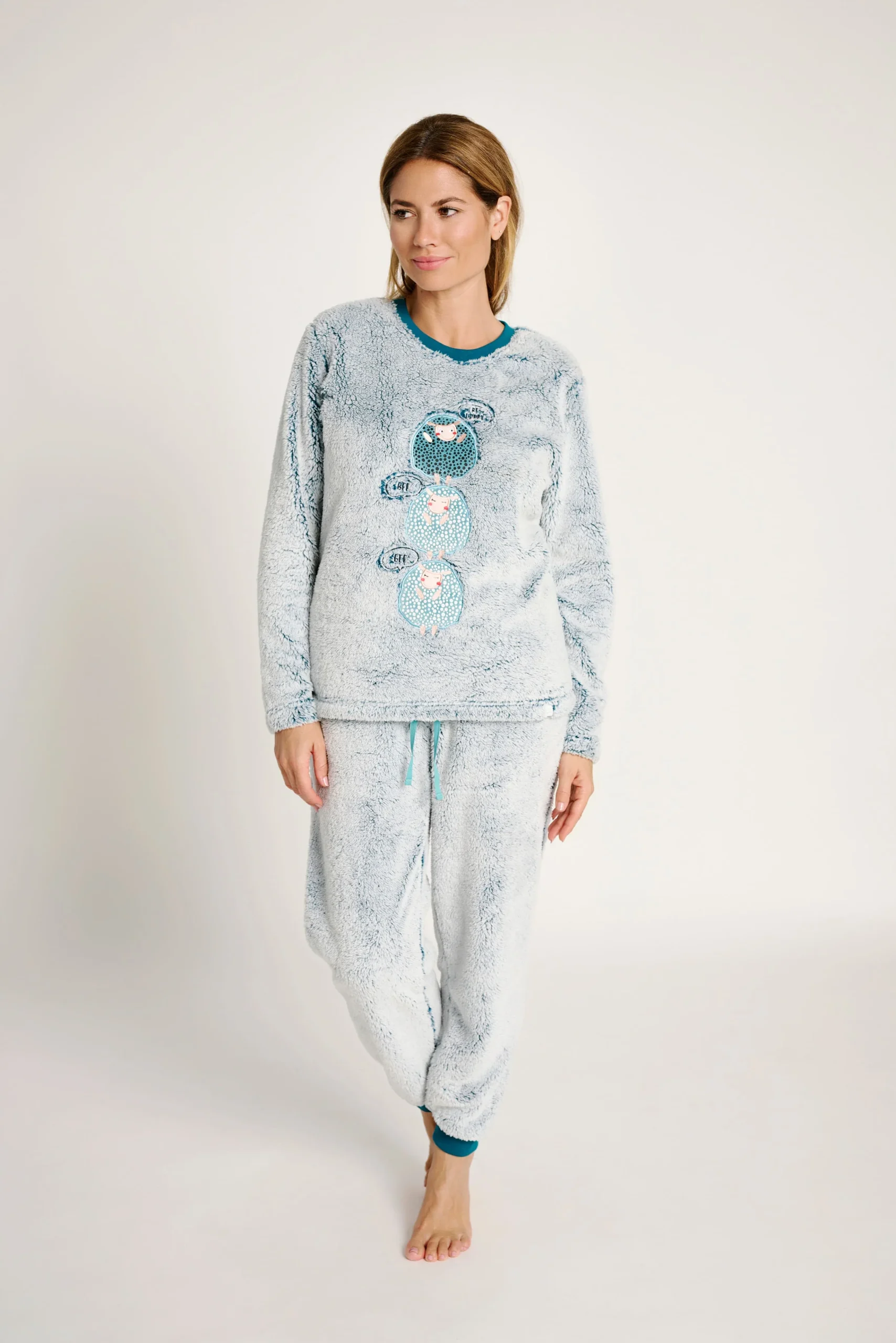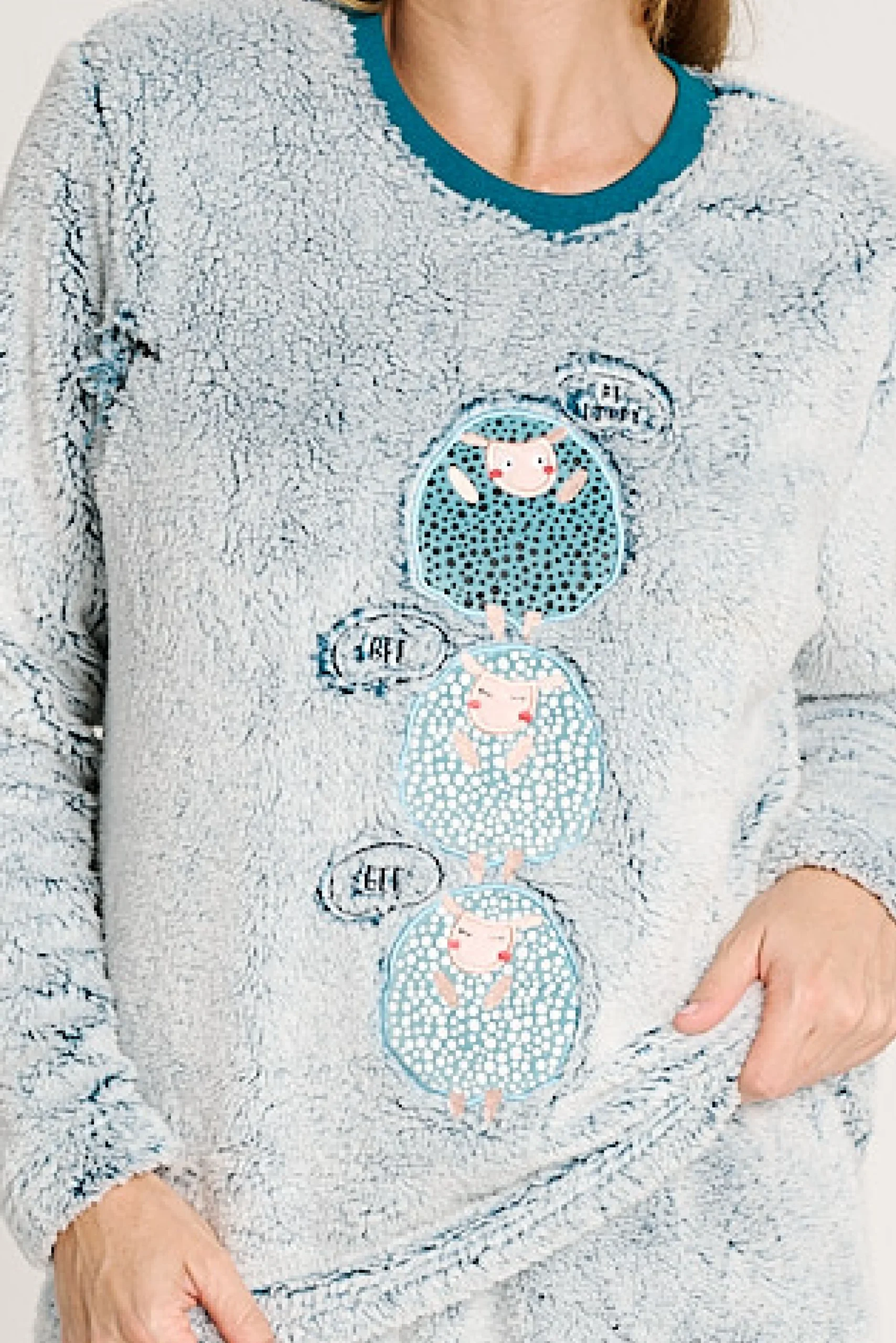 Questo pigiama in due pezzi, realizzato in morbido pile, offre calore e comfort extra per le notti più fredde. Il suo design grigio mélange è abbinato a una simpatica stampa frontale di tre orsi accompagnati da divertenti messaggi. I pantaloni coordinati, con la stessa finitura in pile, hanno un elastico in vita regolabile con coulisse e polsini sul fondo per una migliore vestibilità e un maggiore mantenimento del calore. Ideale per chi cerca comfort e un tocco di tenerezza nel proprio abbigliamento da casa.