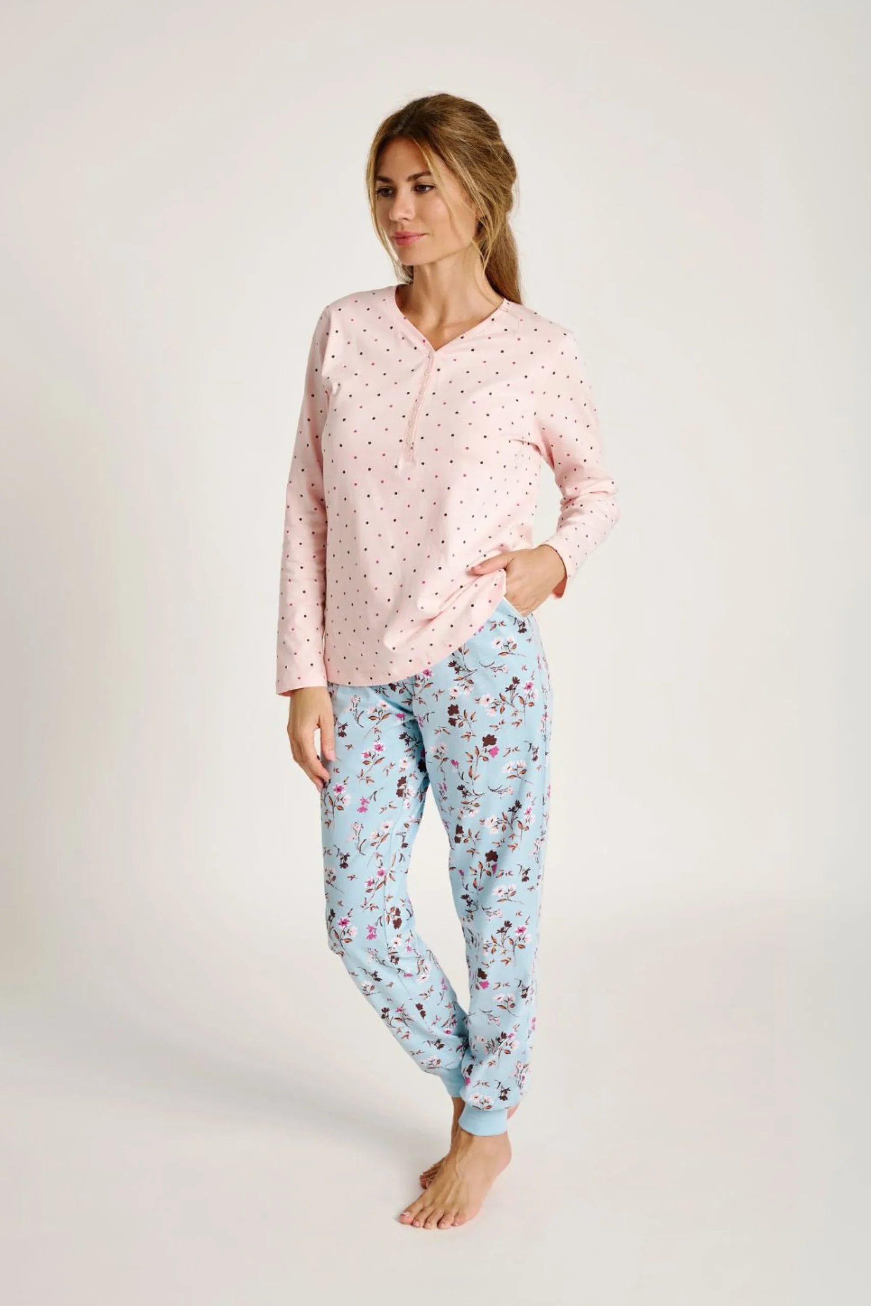 Pigiama due pezzi in morbido tessuto a maglia. T-shirt rosa a maniche lunghe con scollo rotondo e stampa a pois. Pantaloni lunghi azzurri con stampa floreale, elastico in vita e vestibilità comoda per il relax.