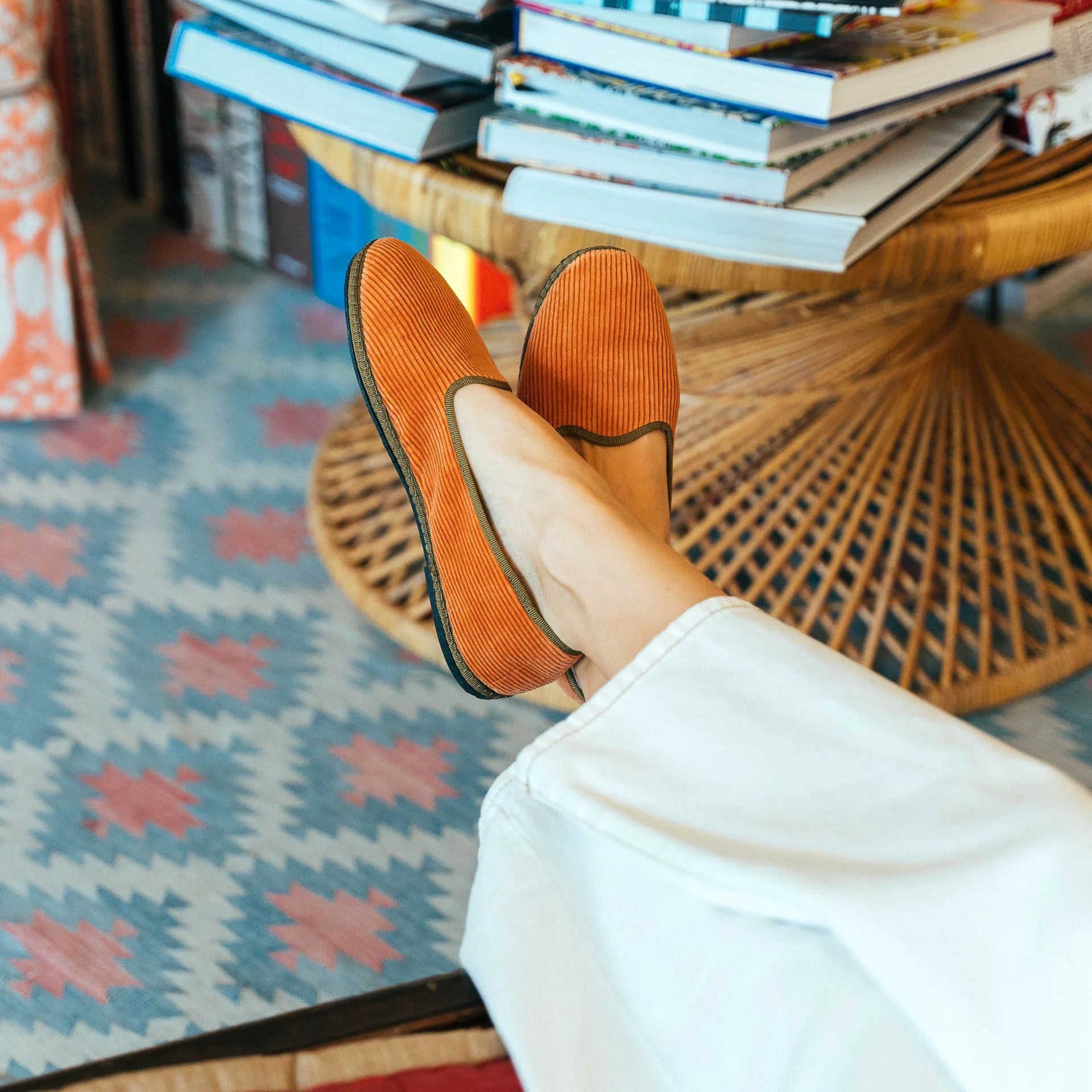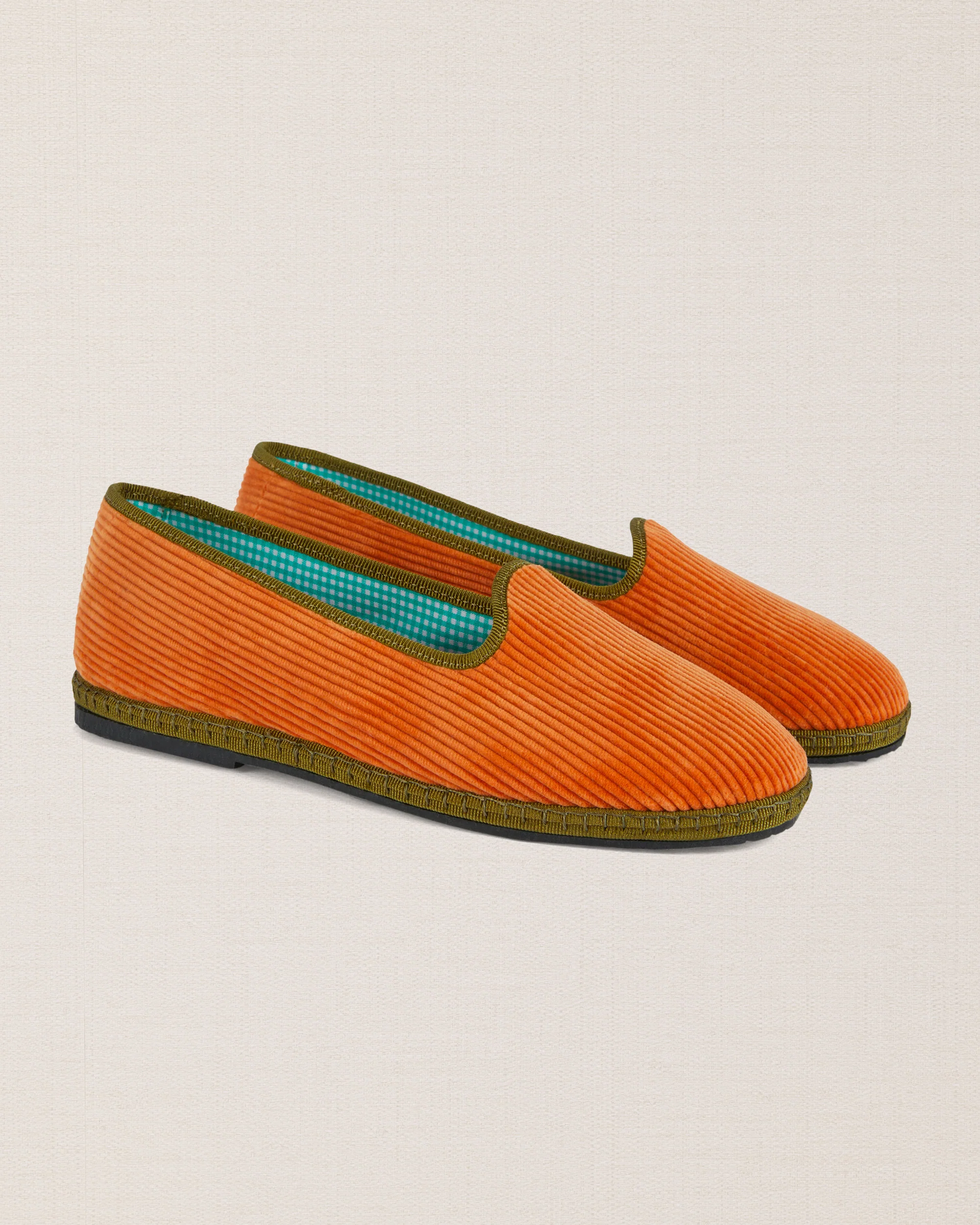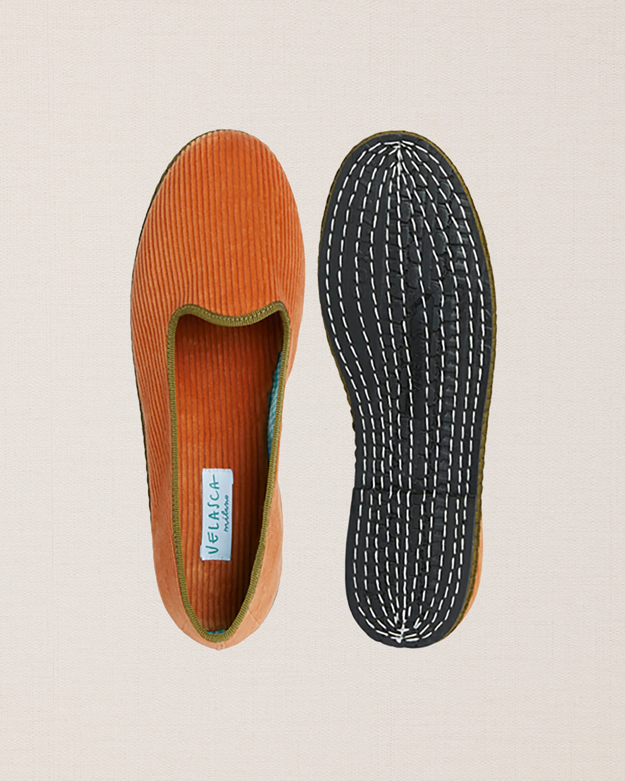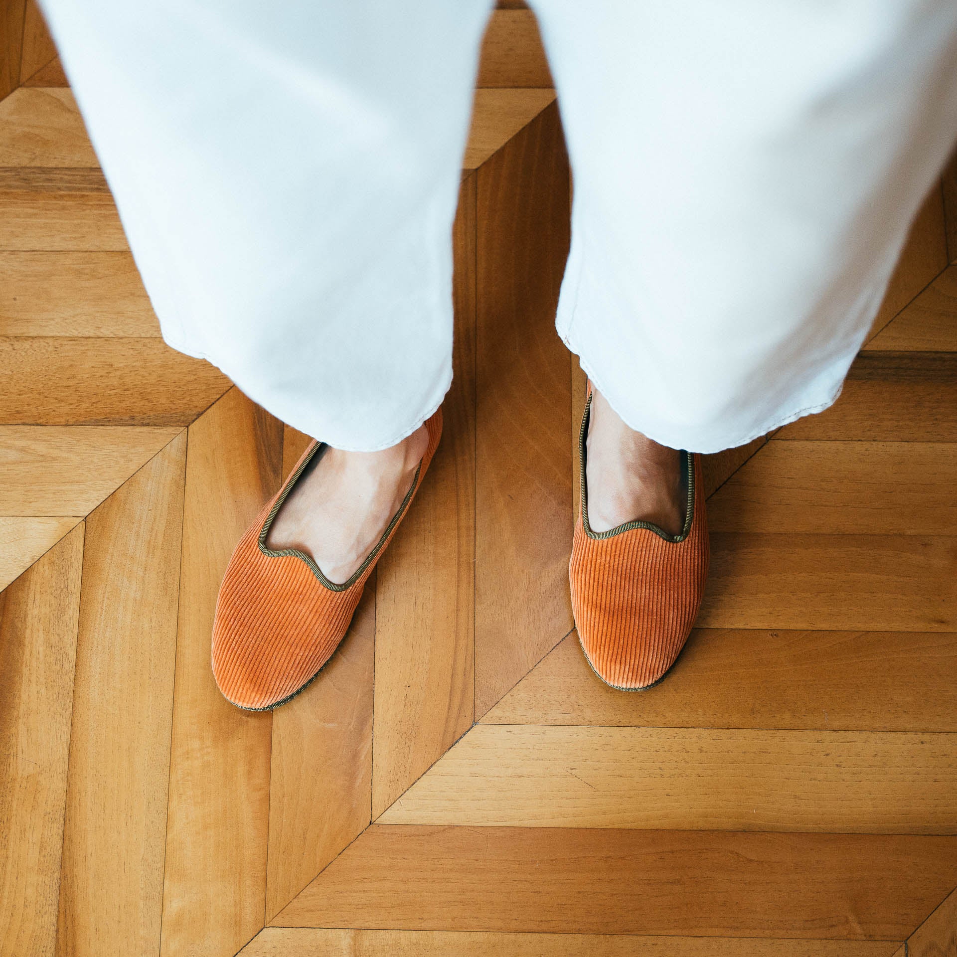 L’iconica friulana, con il nastro di gros grain che disegna tutta la parte superiore della scarpa, detta tomaia. Ti piace il contrasto di colore? Questa versione è in velluto a coste, pensata per l’inverno. Fatta a Gonars (UD).