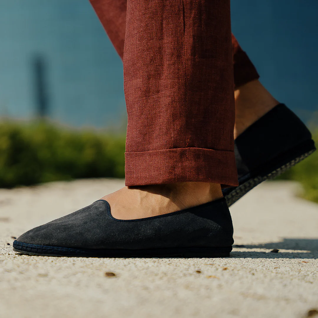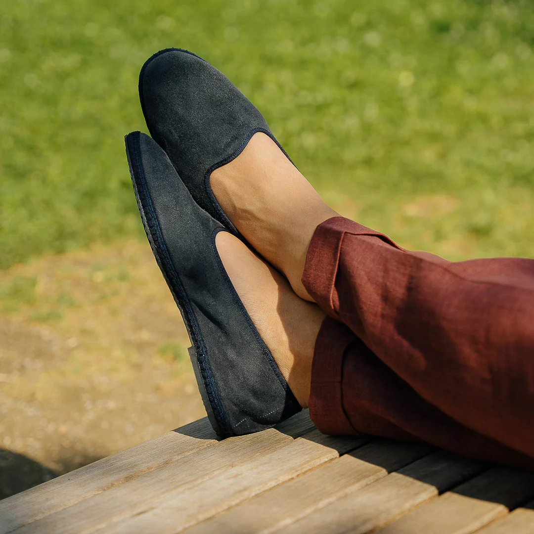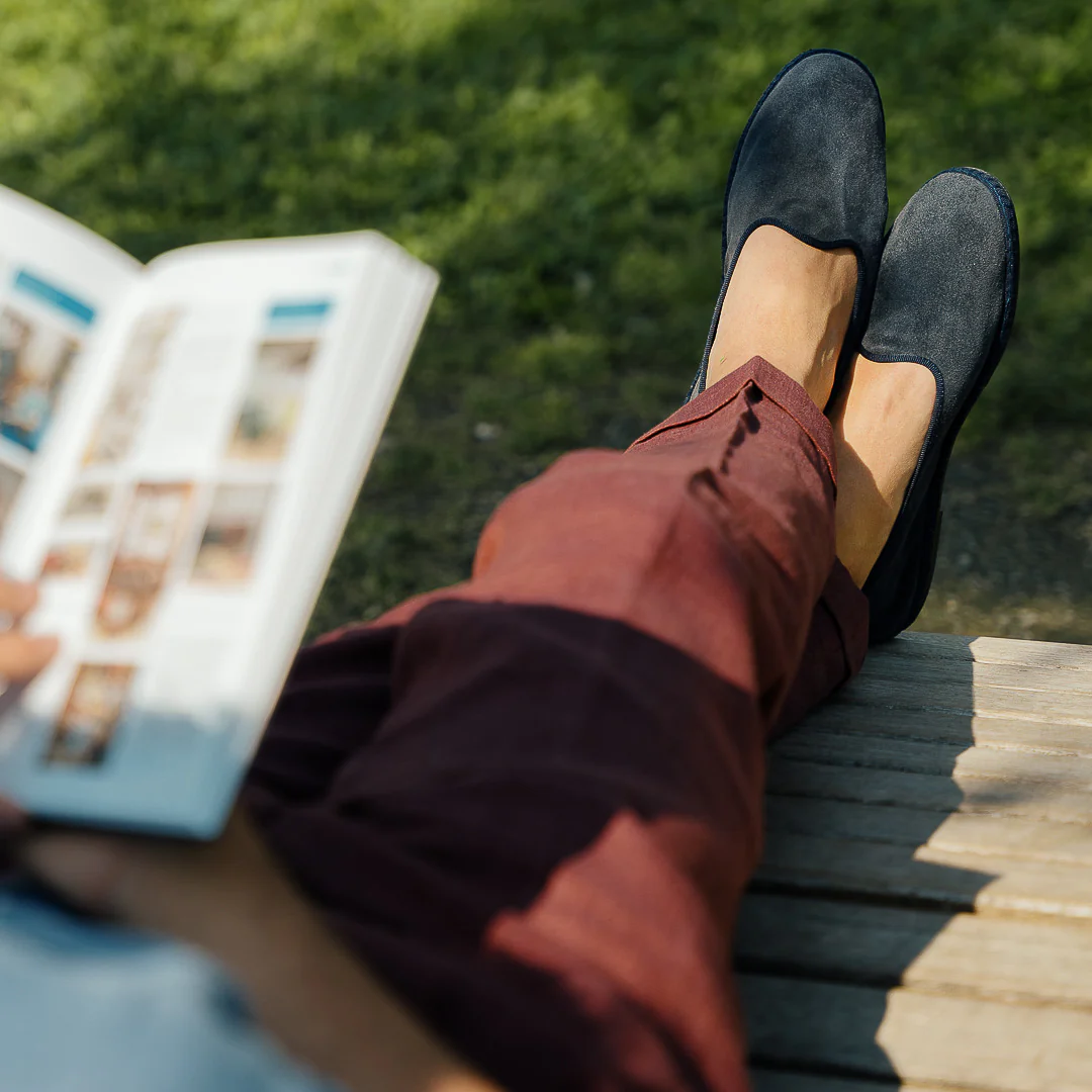 Le Friulane sono le storiche scarpe della tradizione del Friuli: linee semplici unite allo scamosciato, sfoderate e suola in gomma. Originariamente venivano fatte in casa dalle signore dei paesini di montagna, poi trovarono nuova vita tra i canali veneziani: i gondolieri avevano bisogno di una scarpa comoda, stabile e delicata sul legno. La cucitura artigianale è rimasta come una volta: è proprio la mano che, con la sua andatura irregolare, rende ogni scarpa un pezzo unico. Oggi queste calzature sono un simbolo di eleganza: abbinale a un pantalone bordeaux con pinces e una camicia color carta da zucchero, tutto in puro lino. Due chiacchiere al parco.