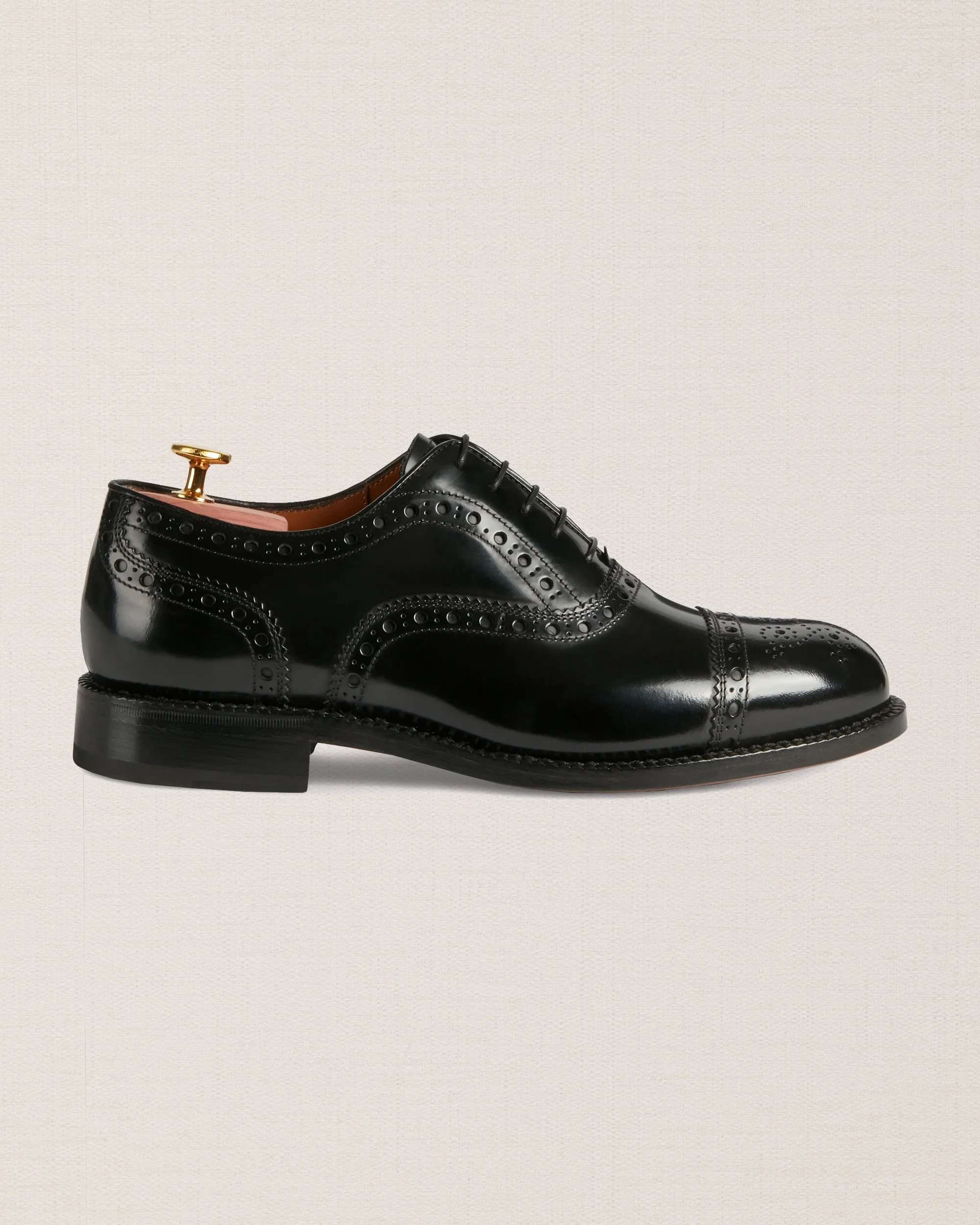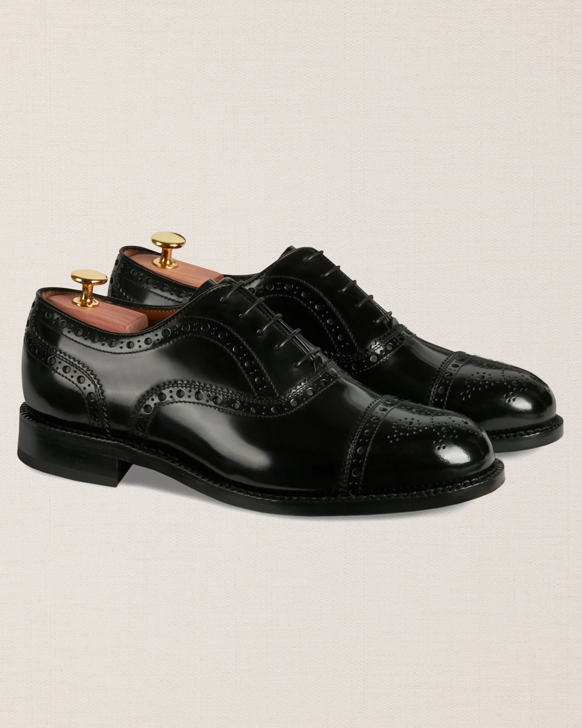 Questa Francesina semi-brogue la riconosceresti ovunque, perché è fatta con la pregiata lavorazione Goodyear. In pelle di vitello liscia spazzolata e suola in cuoio, è pensata per durare nel tempo: la tradizionale cucitura “a guardolo”, oltre a conferire resistenza, rende la scarpa facilmente risuolabile. Lo strato in sughero tra il sottopiede e la suola accoglie il tuo piede: più la indossi e più si adatta. Abbinala con un abito blu in lana e cashmere: giacca destrutturata e pantalone con doppia pince, camicia a righe e cravatta in lana stampata.
