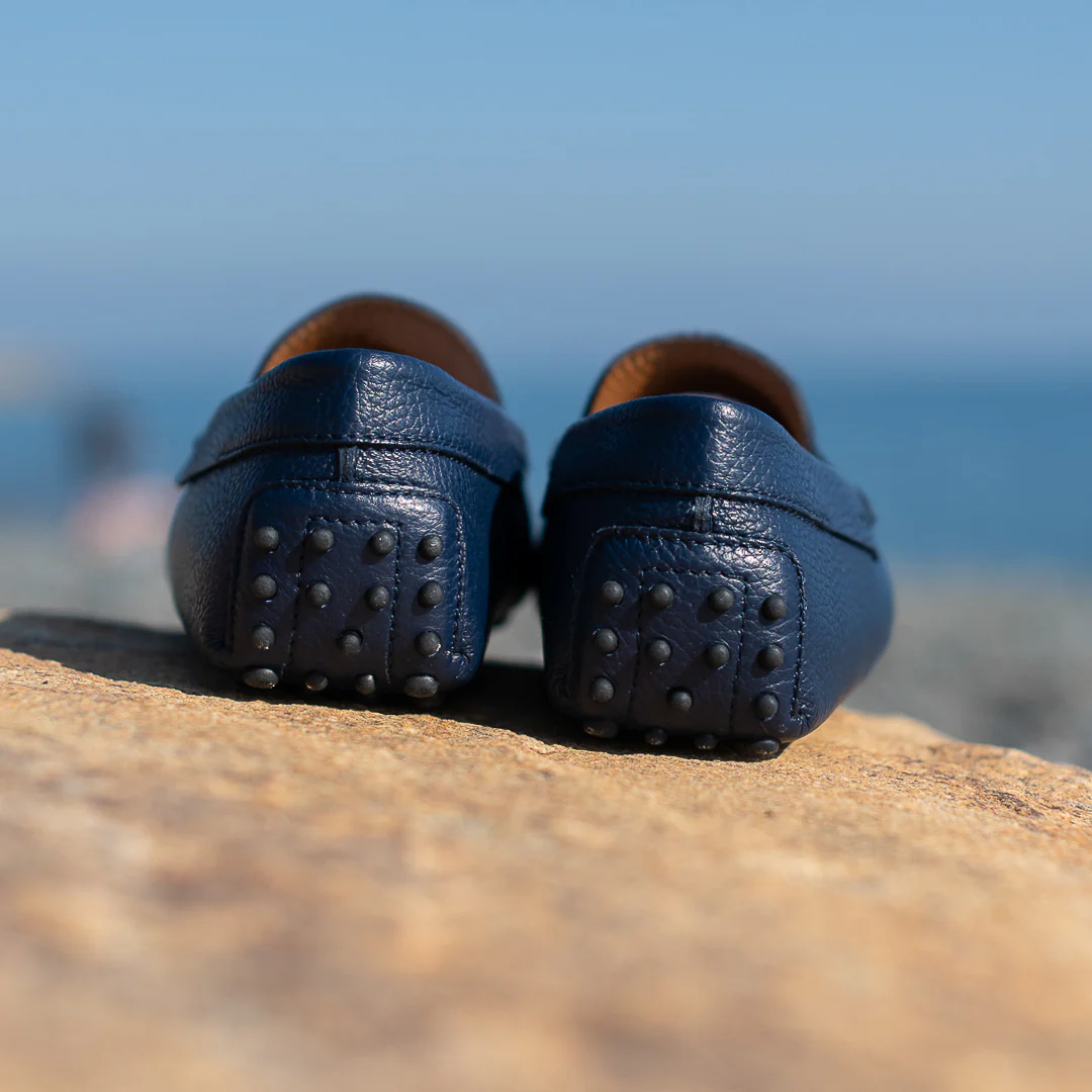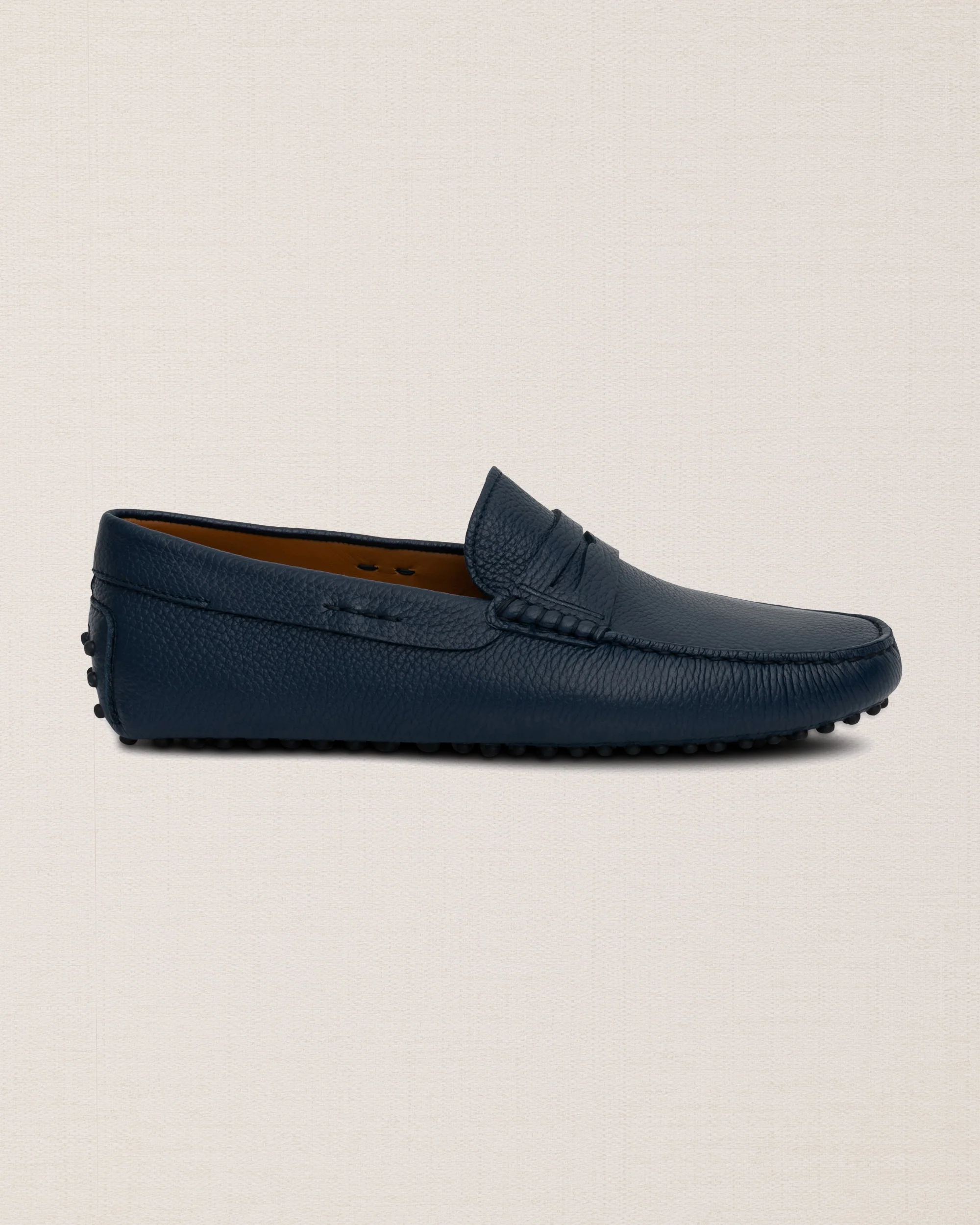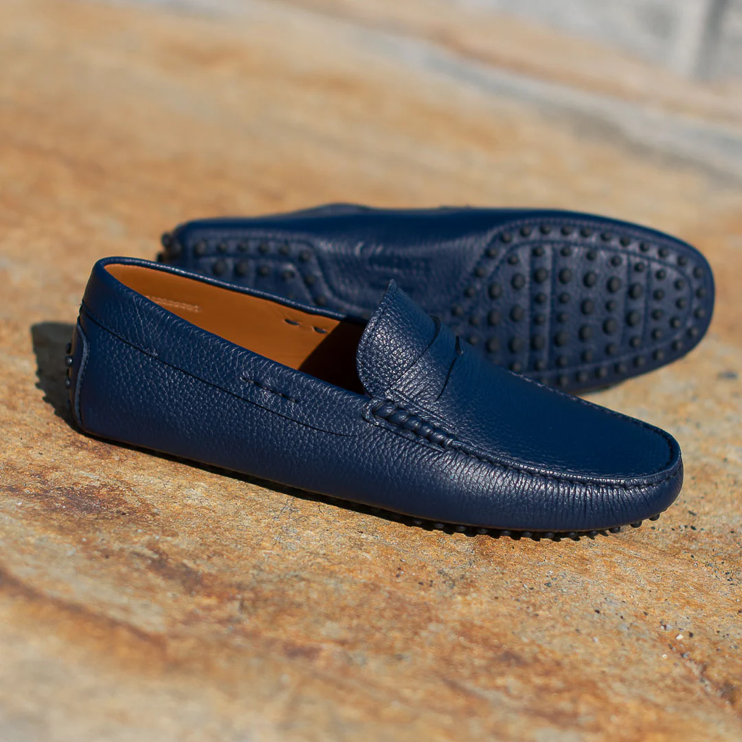 È il Mocassino con gommini e la classica mascherina riconoscibile nelle Penny Loafers. Grazie alla pelle di vitello martellata e alla sua suola con gommini, è il Mocassino blu scuro per l’uomo a cui piace una vita comoda e di classe.