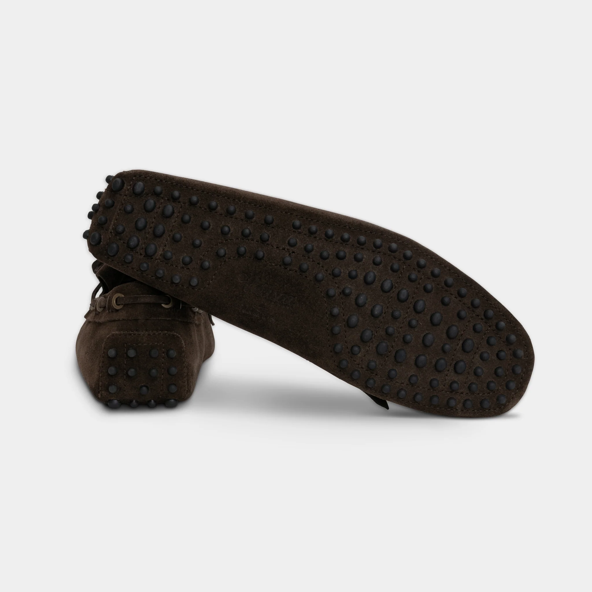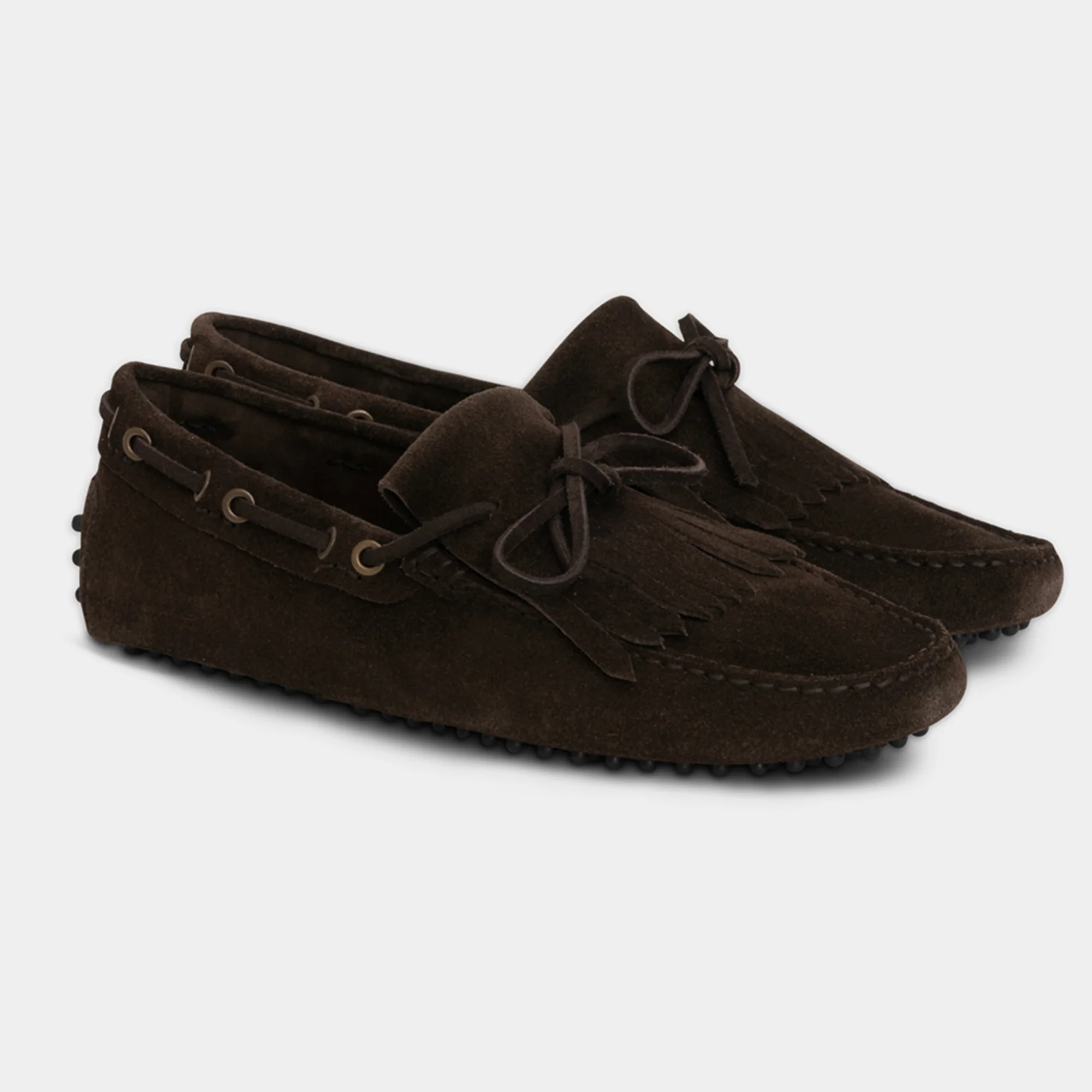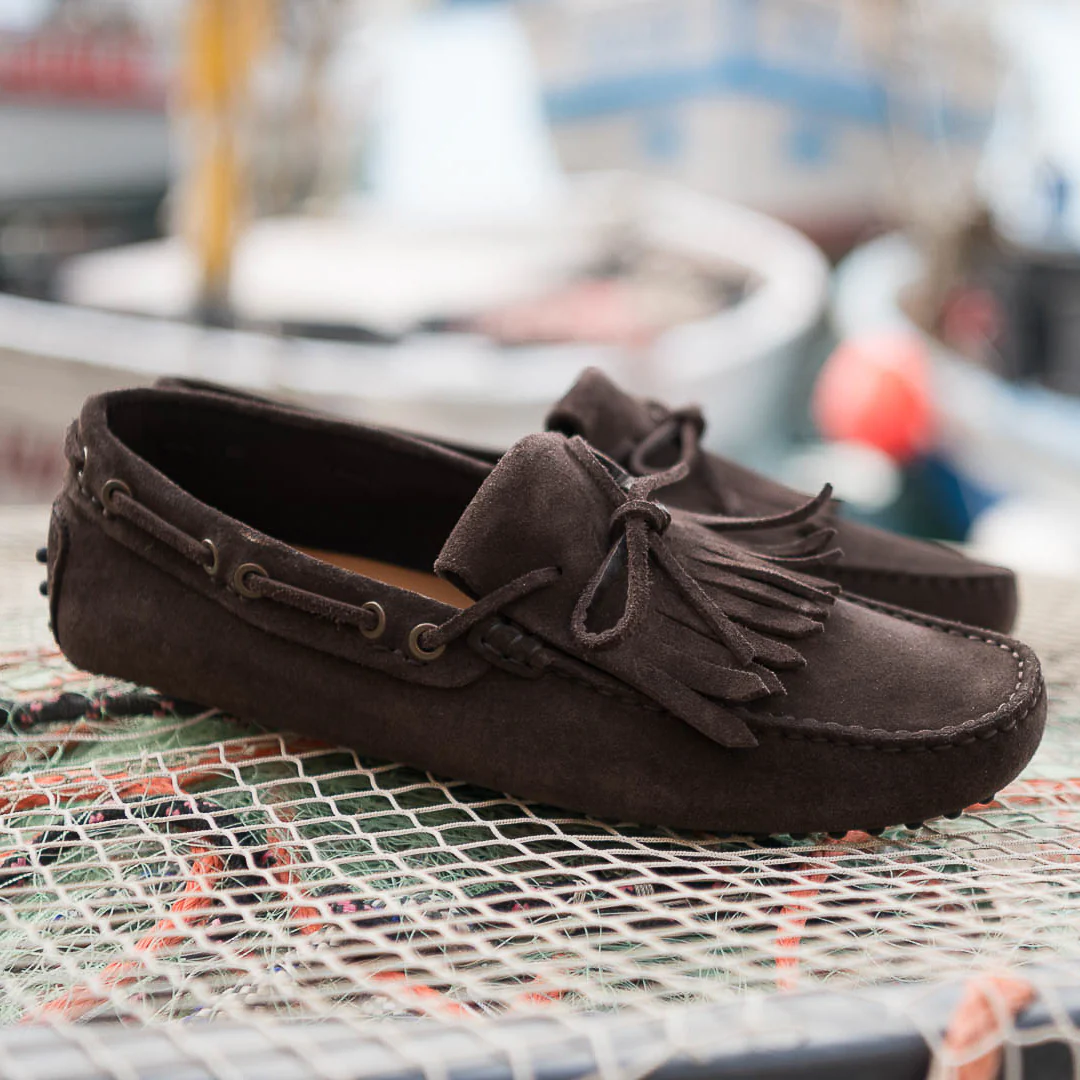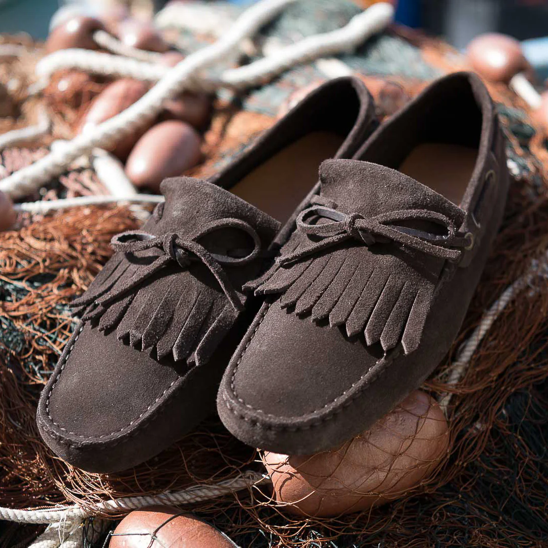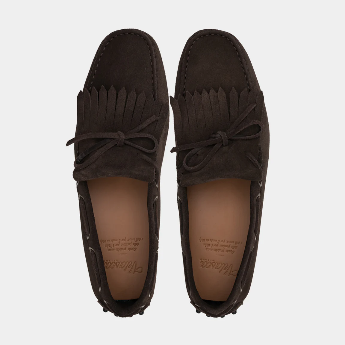 È il Mocassino dalle linee classiche con un’anima dandy: oltre ai suoi laccetti è stata applicata a mano una frangia. Grazie alla pelle di vitello scamosciata e alla sua suola con gommini, è la non stringata marrone testa di moro con frangetta in tinta per l’uomo che sa come sfoggiare tutti i dettagli di cui ha bisogno. È il Mocassino della tua estate.