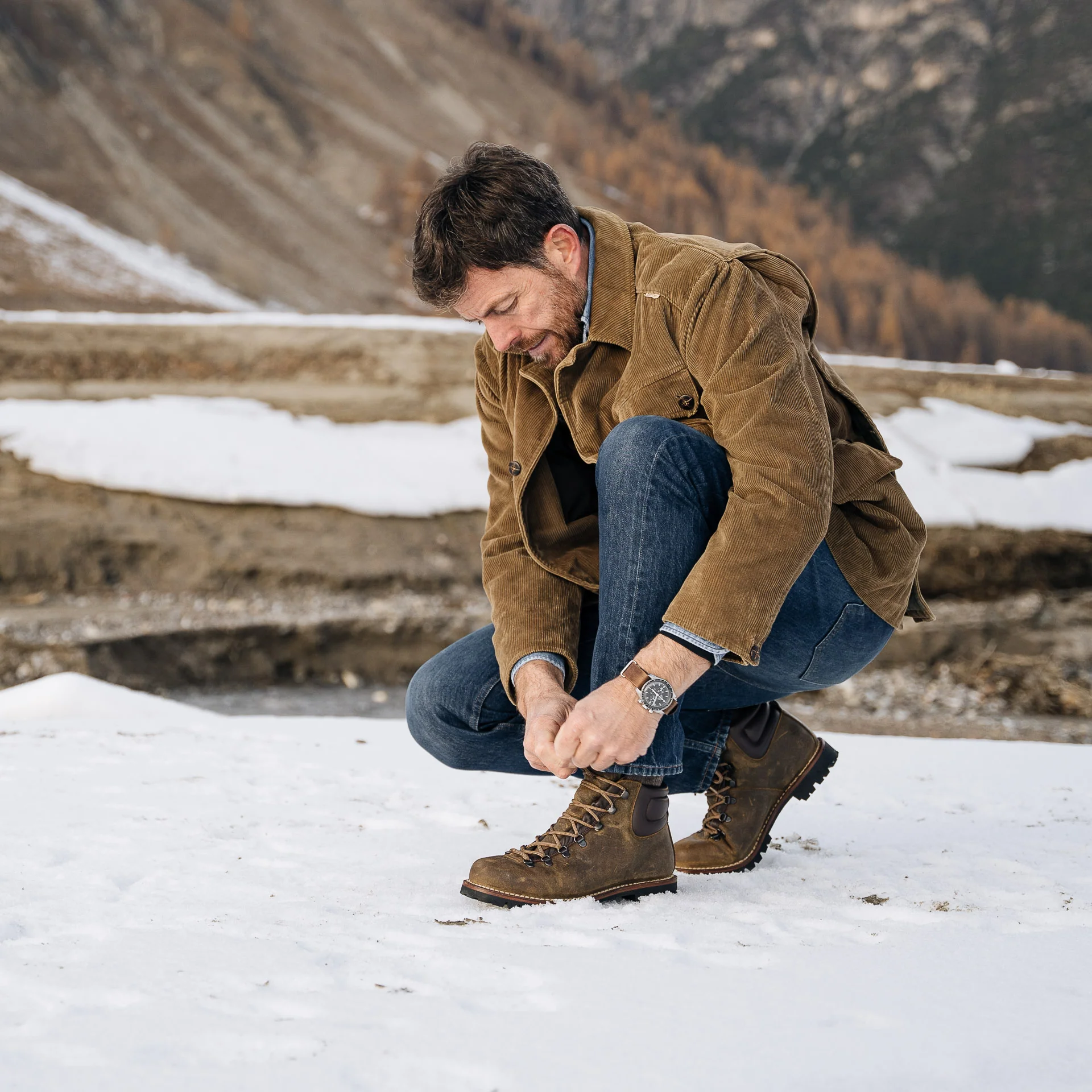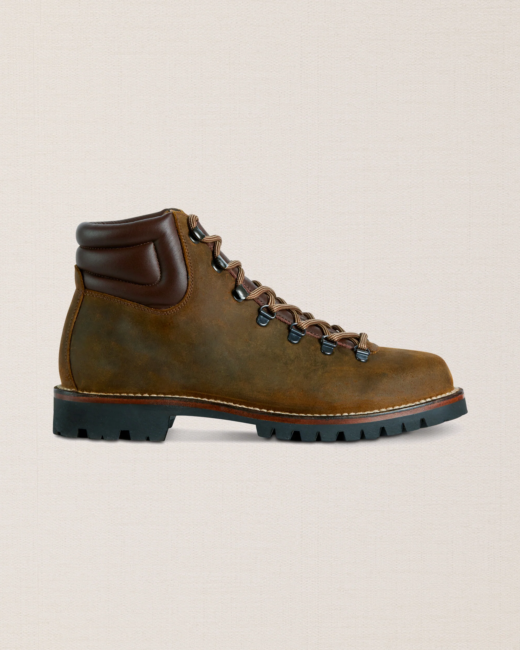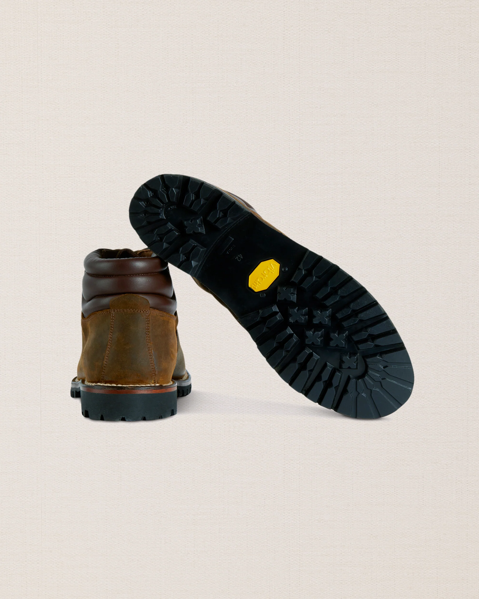 La nostra Pedula dalle tonalità verdi in pelle scamosciata ingrassata è ispirata alla vita di montagna. È costruita per essere uno stivaletto solido e avvolgente, per accompagnarti nelle tue giornate d’inverno: tra la fodera e la pelle abbiamo inserito una membrana che ne aumenta la resistenza all’acqua; in più sulla linguetta non ci sono aperture, è un unico pezzo, così da tenere a bada la pioggia. Ornata con lacci bicolore e cucitura a vista, si unisce perfettamente alla suola in gomma Vibram. Due passi nella neve, jeans chiaro, dolcevita beige e cappotto pied de poule.