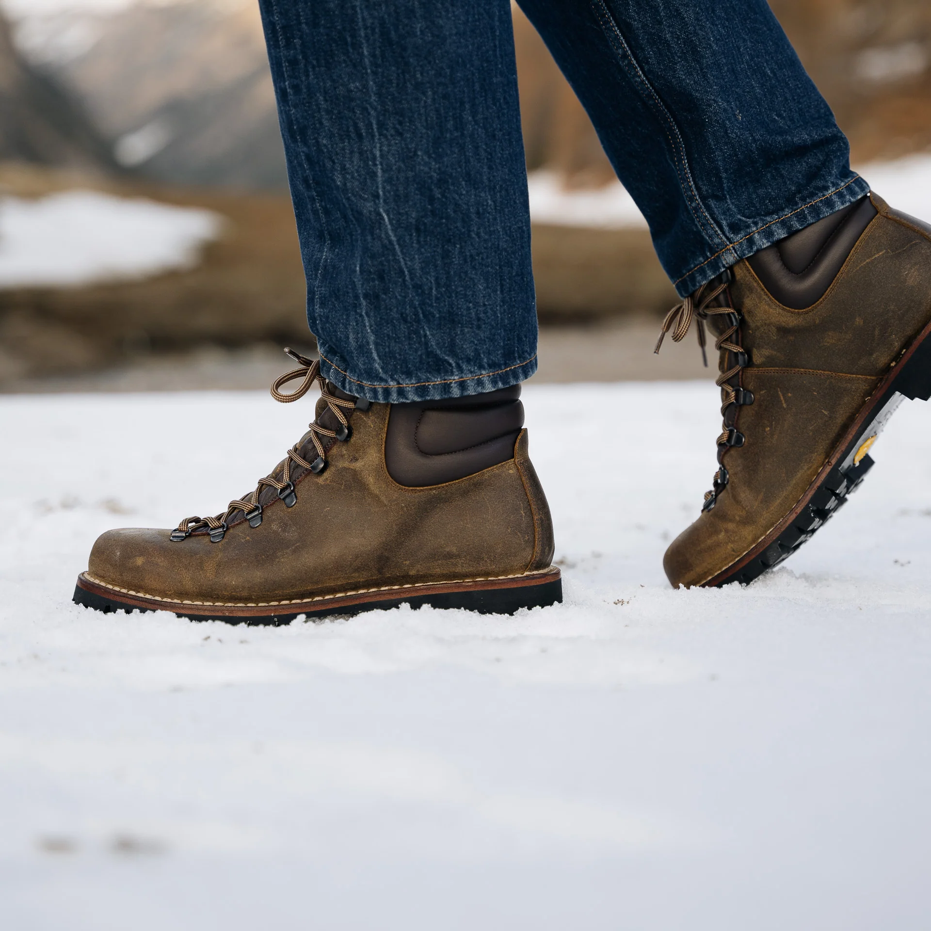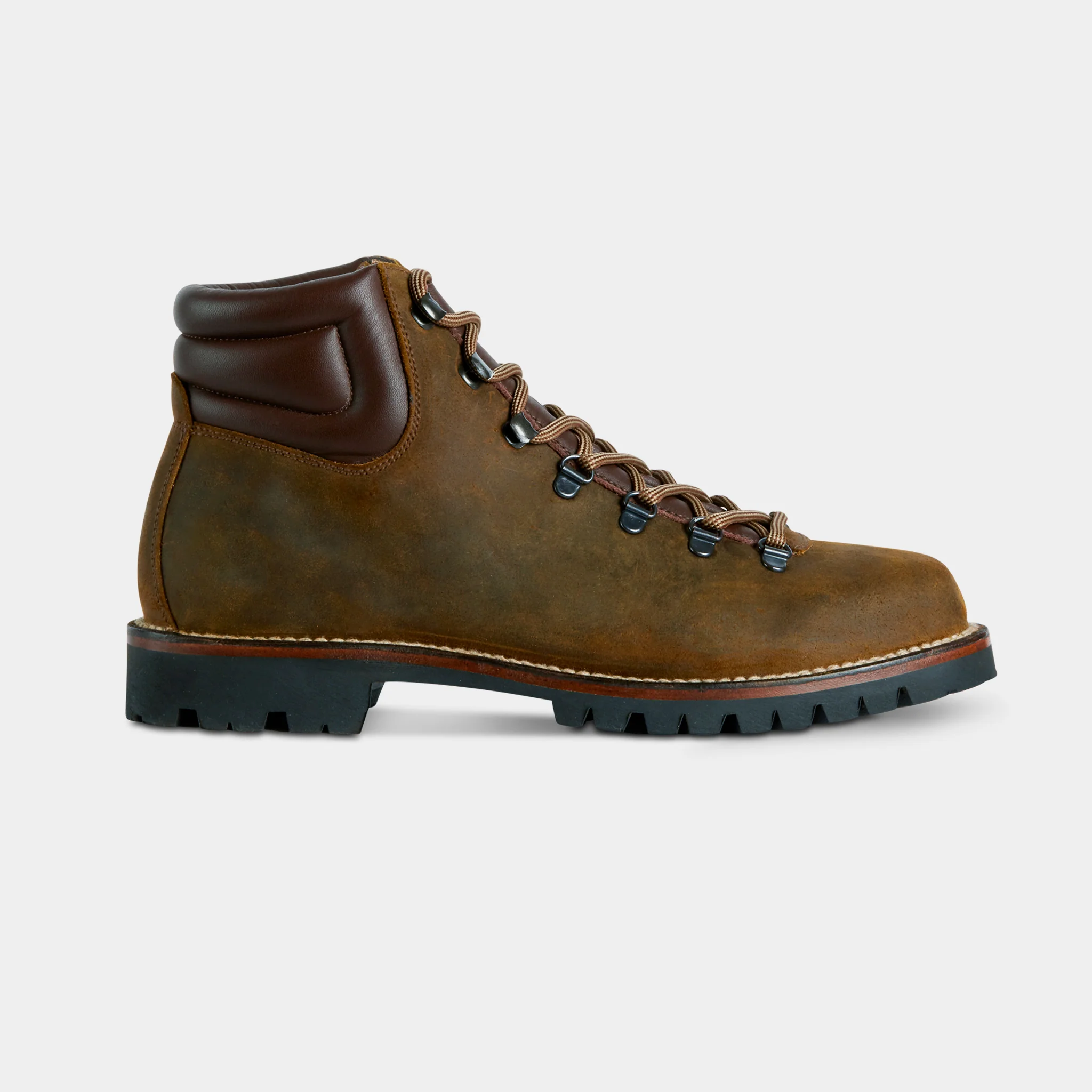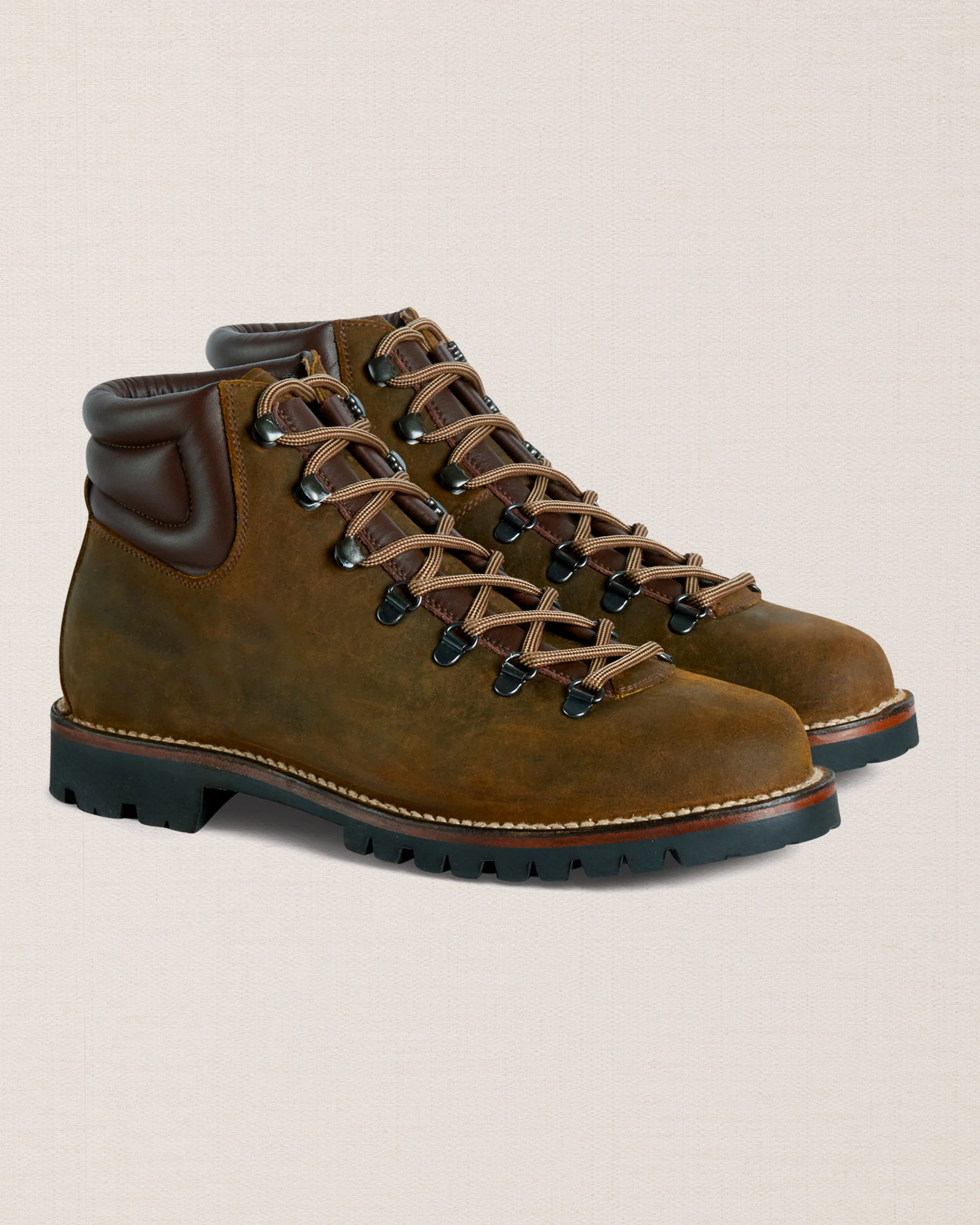 La nostra Pedula dalle tonalità verdi in pelle scamosciata ingrassata è ispirata alla vita di montagna. È costruita per essere uno stivaletto solido e avvolgente, per accompagnarti nelle tue giornate d’inverno: tra la fodera e la pelle abbiamo inserito una membrana che ne aumenta la resistenza all’acqua; in più sulla linguetta non ci sono aperture, è un unico pezzo, così da tenere a bada la pioggia. Ornata con lacci bicolore e cucitura a vista, si unisce perfettamente alla suola in gomma Vibram. Due passi nella neve, jeans chiaro, dolcevita beige e cappotto pied de poule.