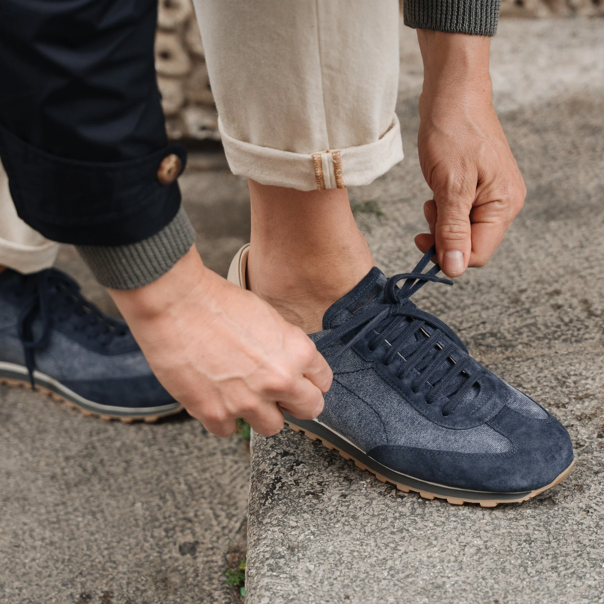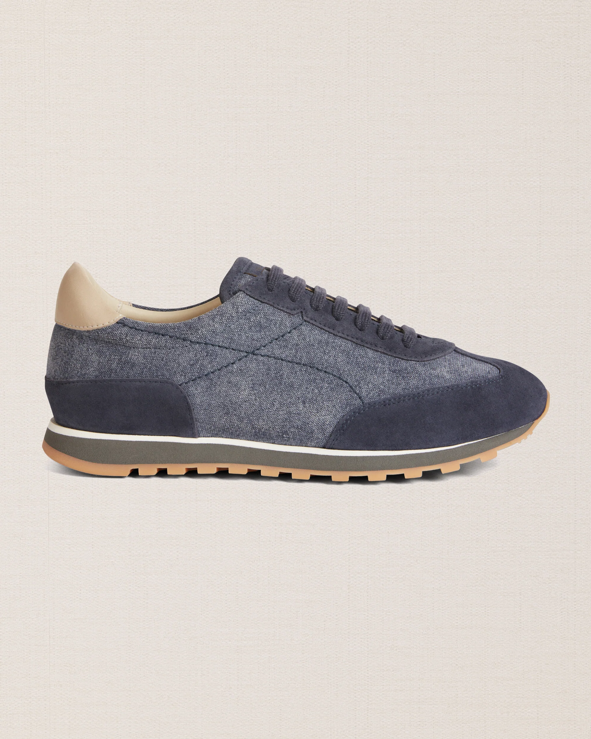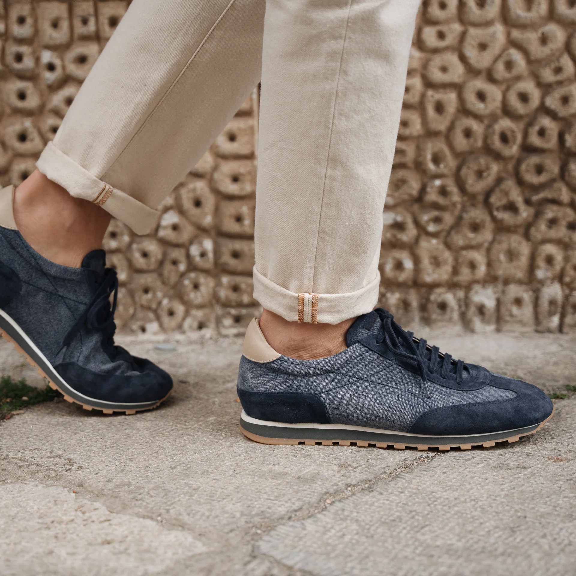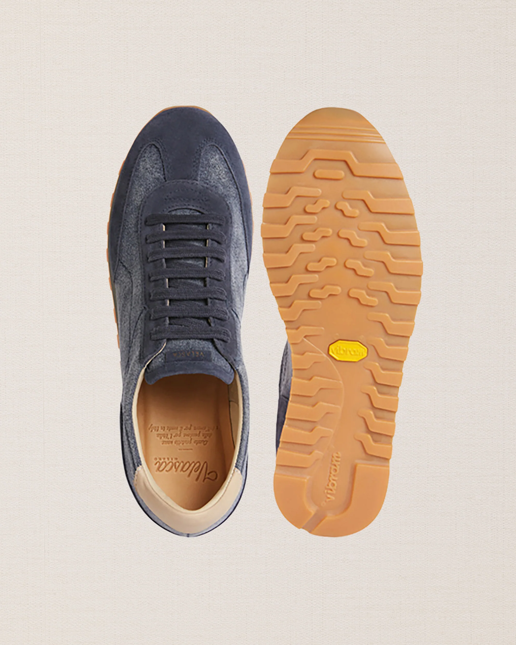La nostra sneaker blu ispirata ai modelli running, in pelle scamosciata con dettagli in tessuto. È pensata per essere fresca e leggera, per questo abbiamo accostato alla suola in gomma Vibram, un’intersuola in micro: un materiale estremamente leggero e flessibile. Ai piedi, un’anima vintage, dalla forma affusolata.
