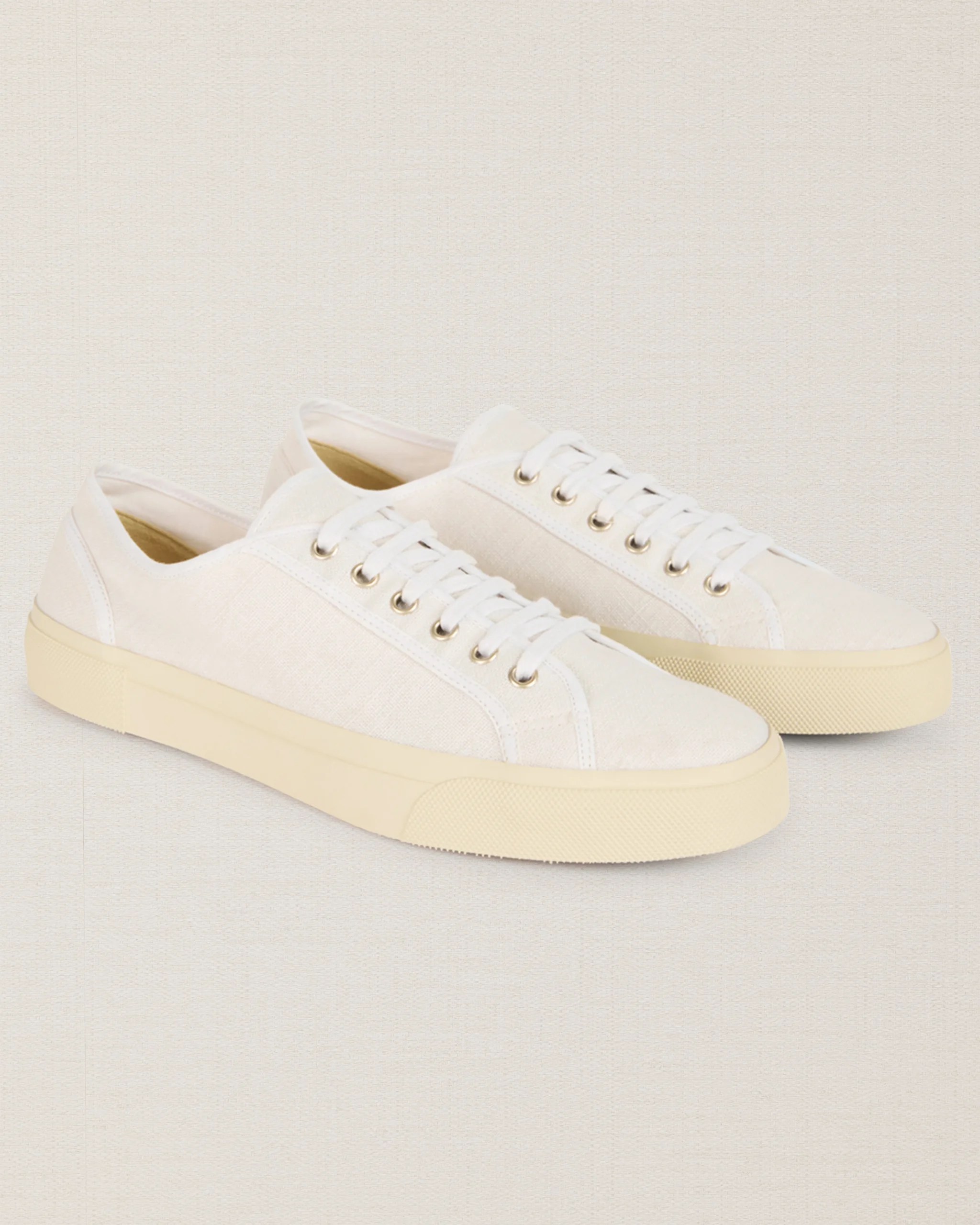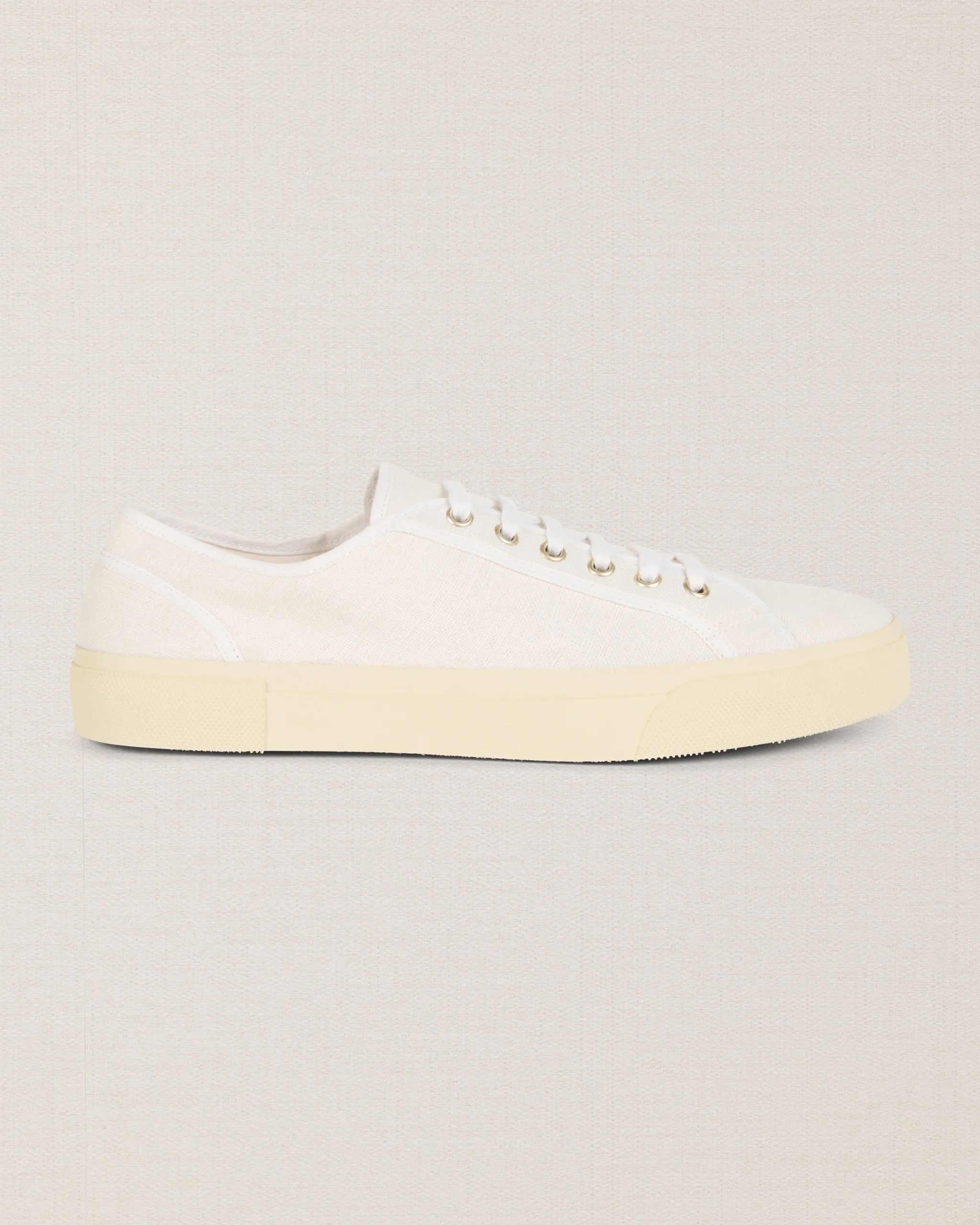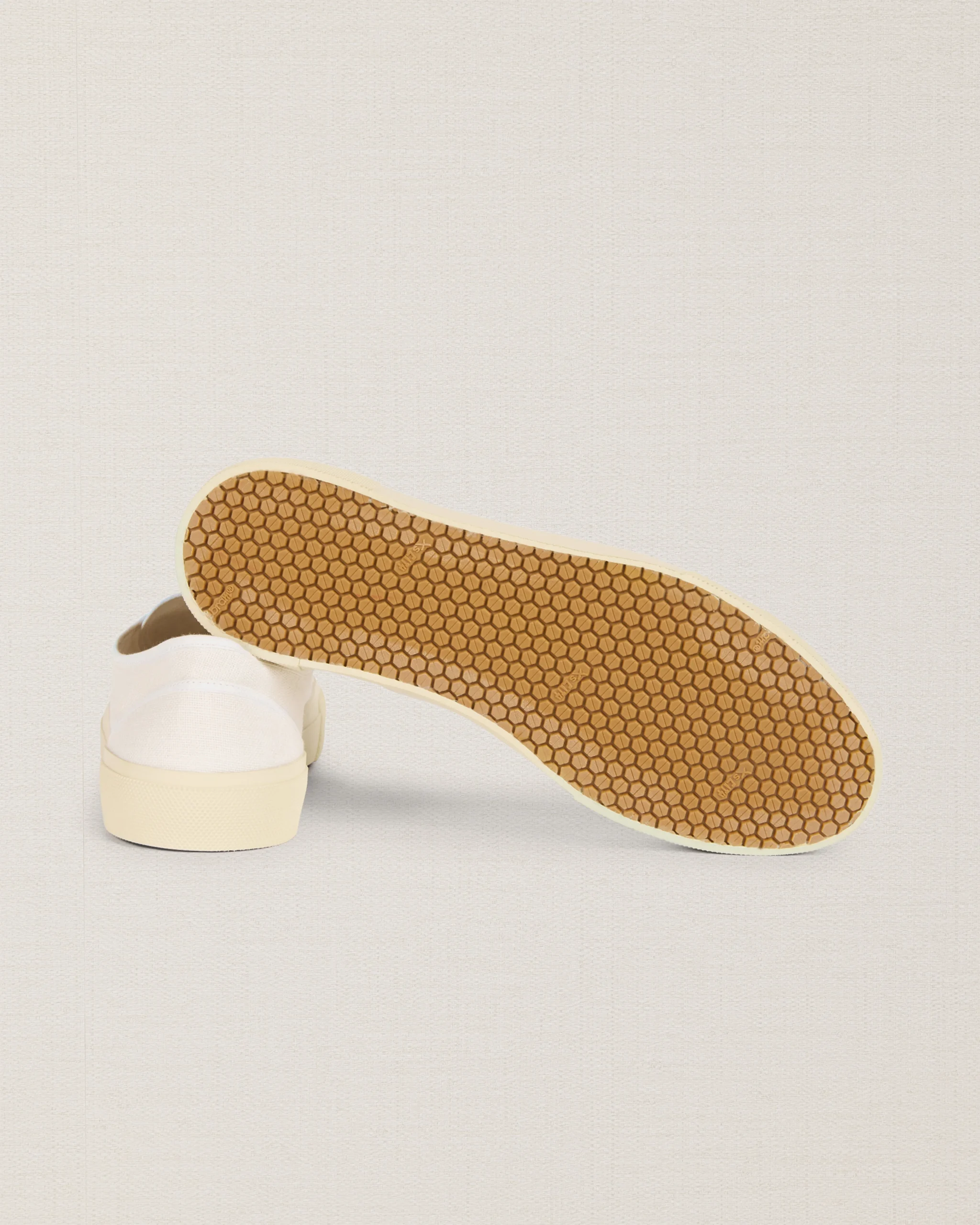 Le nostre Sneakers artigianali dall’anima vintage, in lino bianco. La suola è composta da una fascia in gomma, che avvolge e unisce la suola Vibram alla tomaia in lino. L’estate aspetta, le calze non sono invitate.