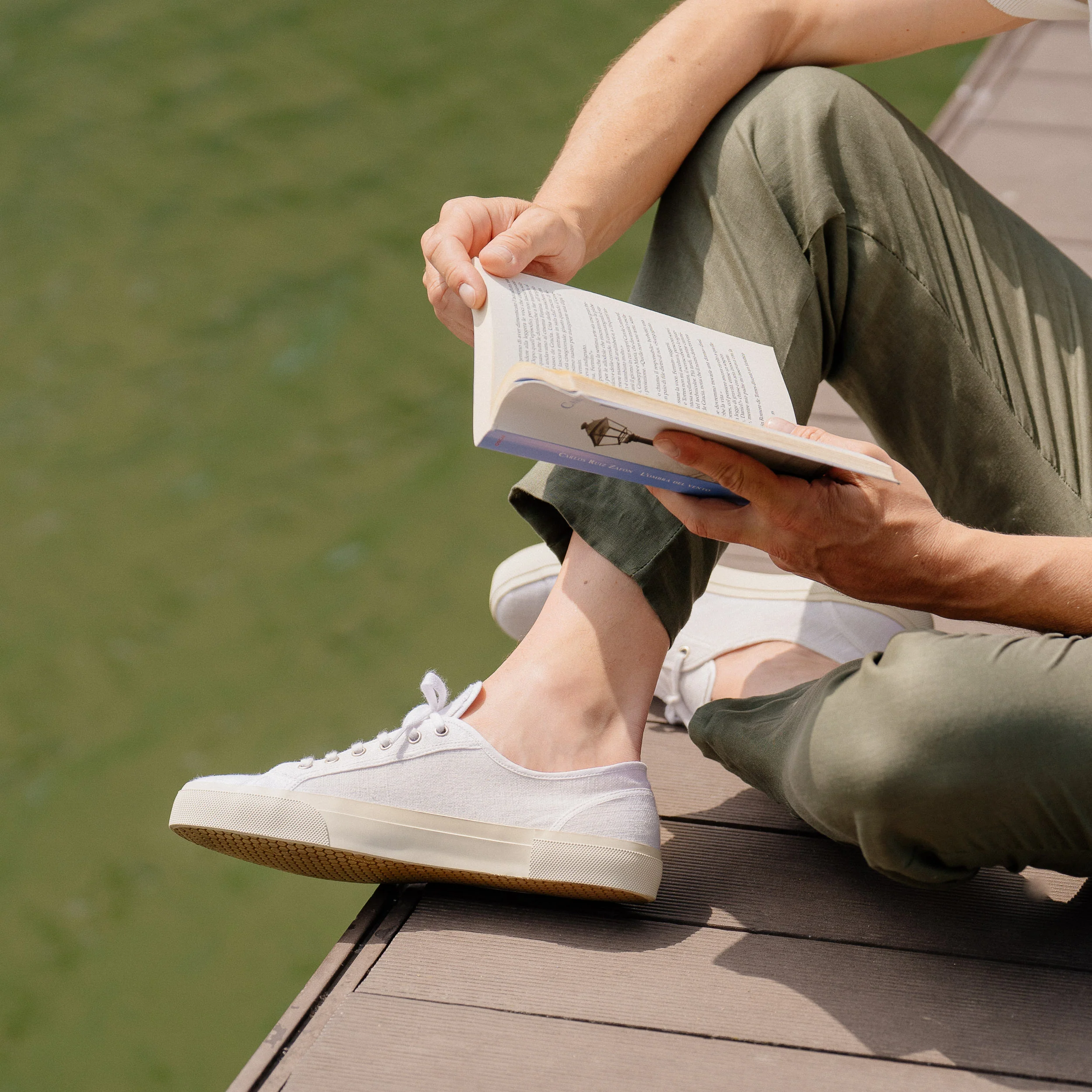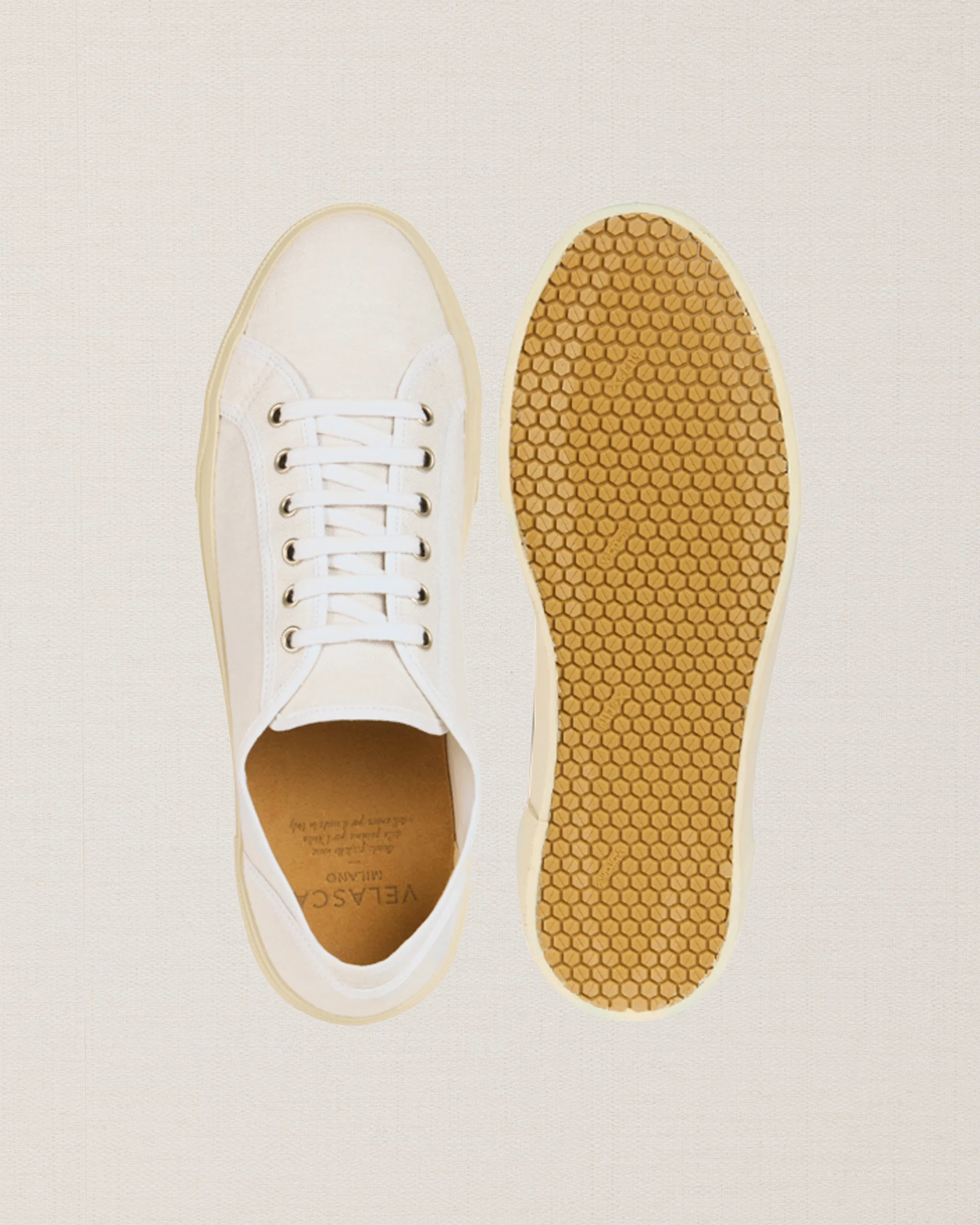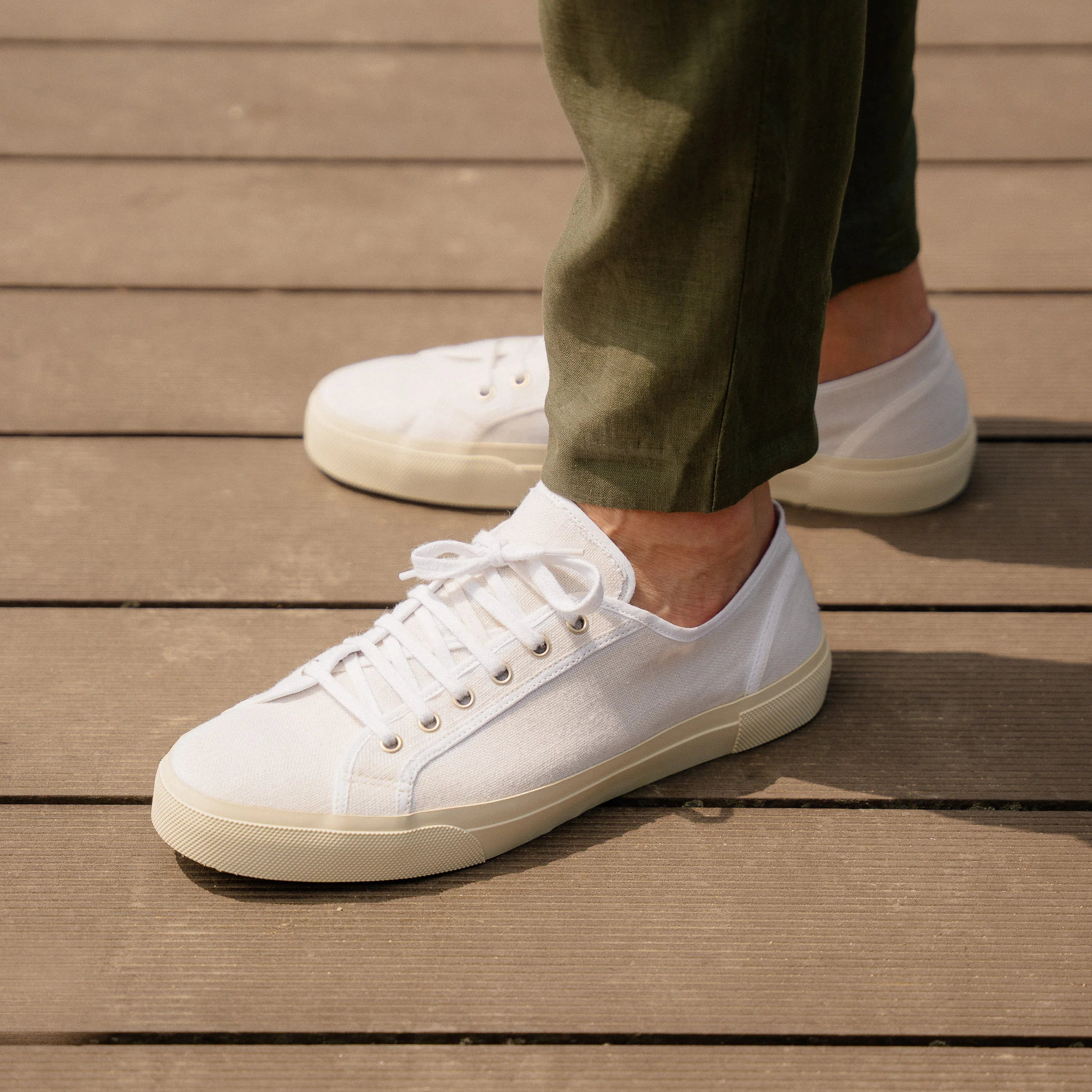 Le nostre Sneakers artigianali dall’anima vintage, in lino bianco. La suola è composta da una fascia in gomma, che avvolge e unisce la suola Vibram alla tomaia in lino. L’estate aspetta, le calze non sono invitate.