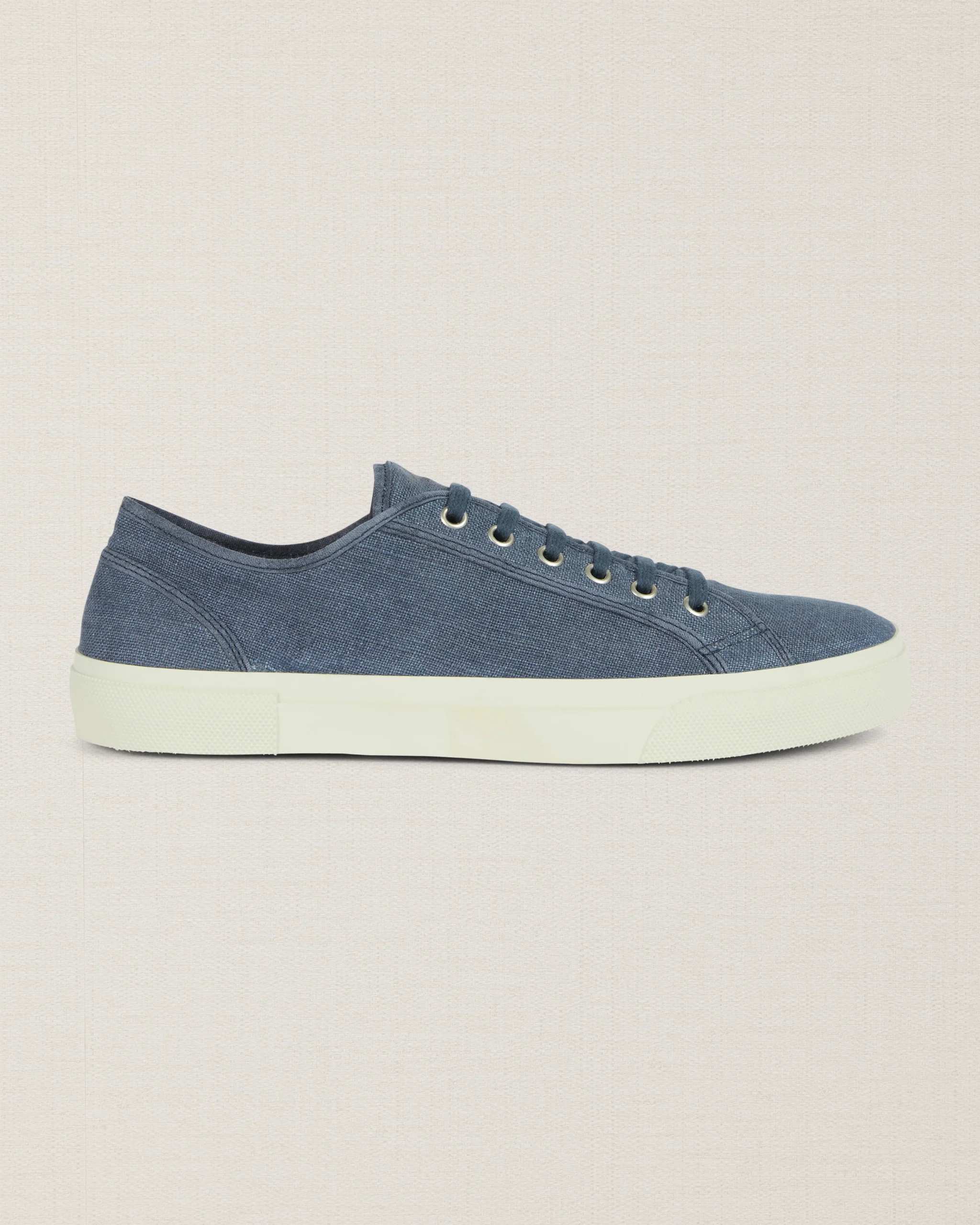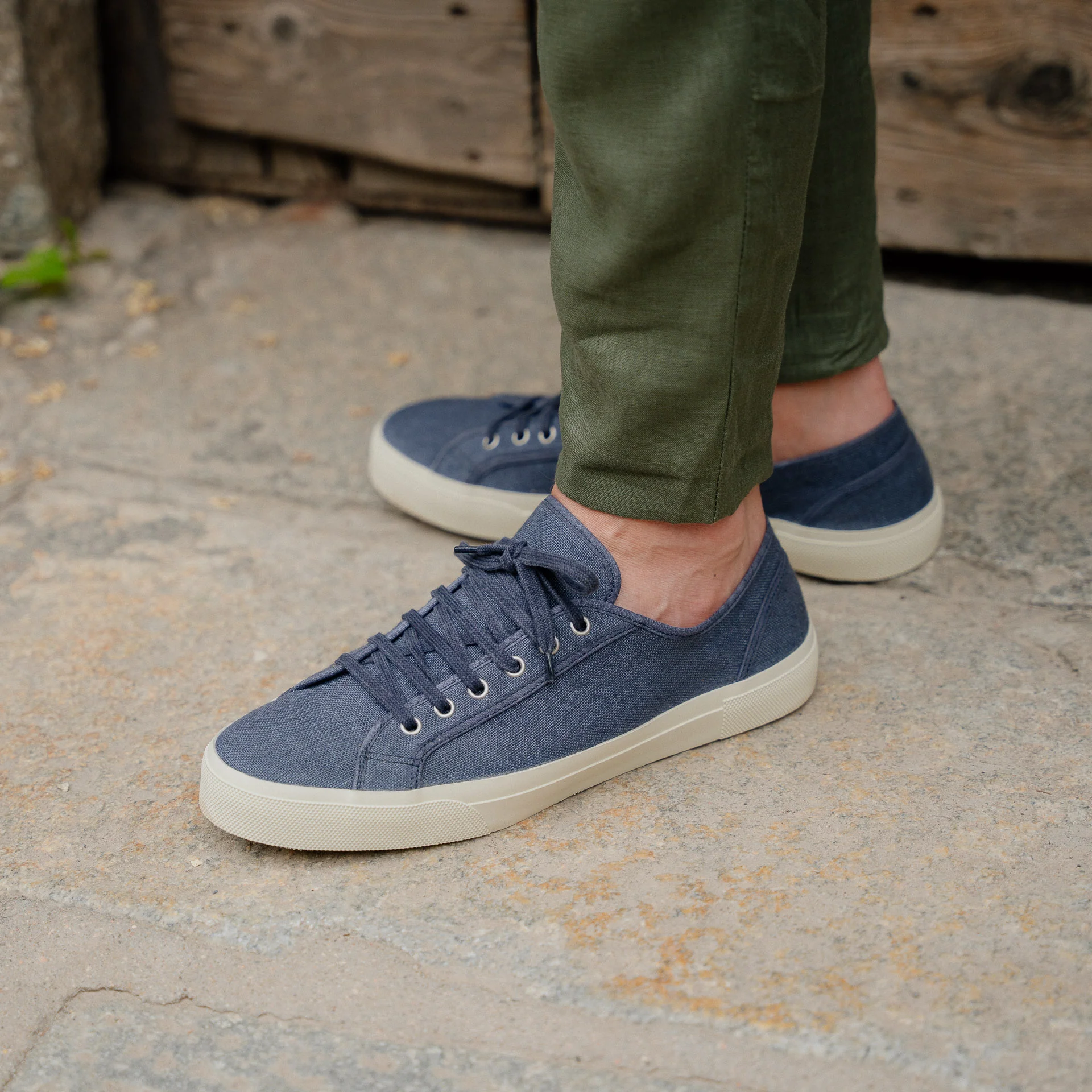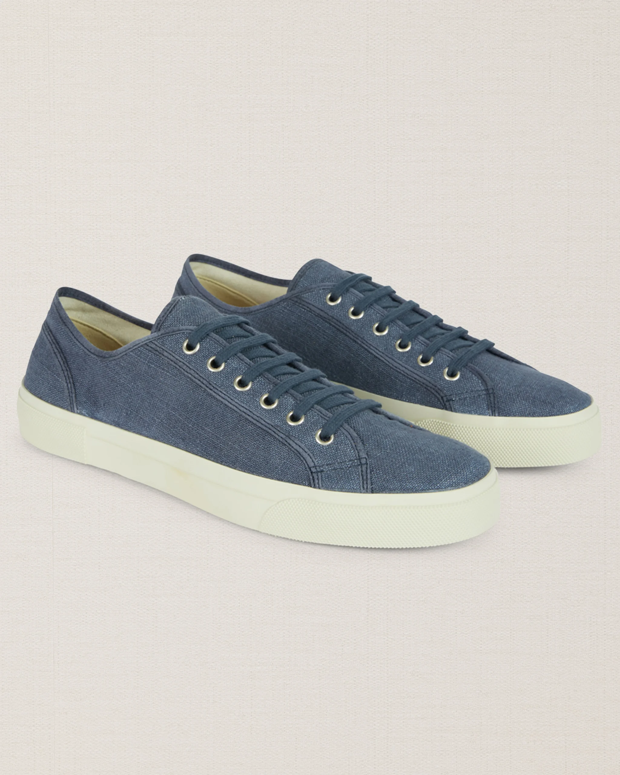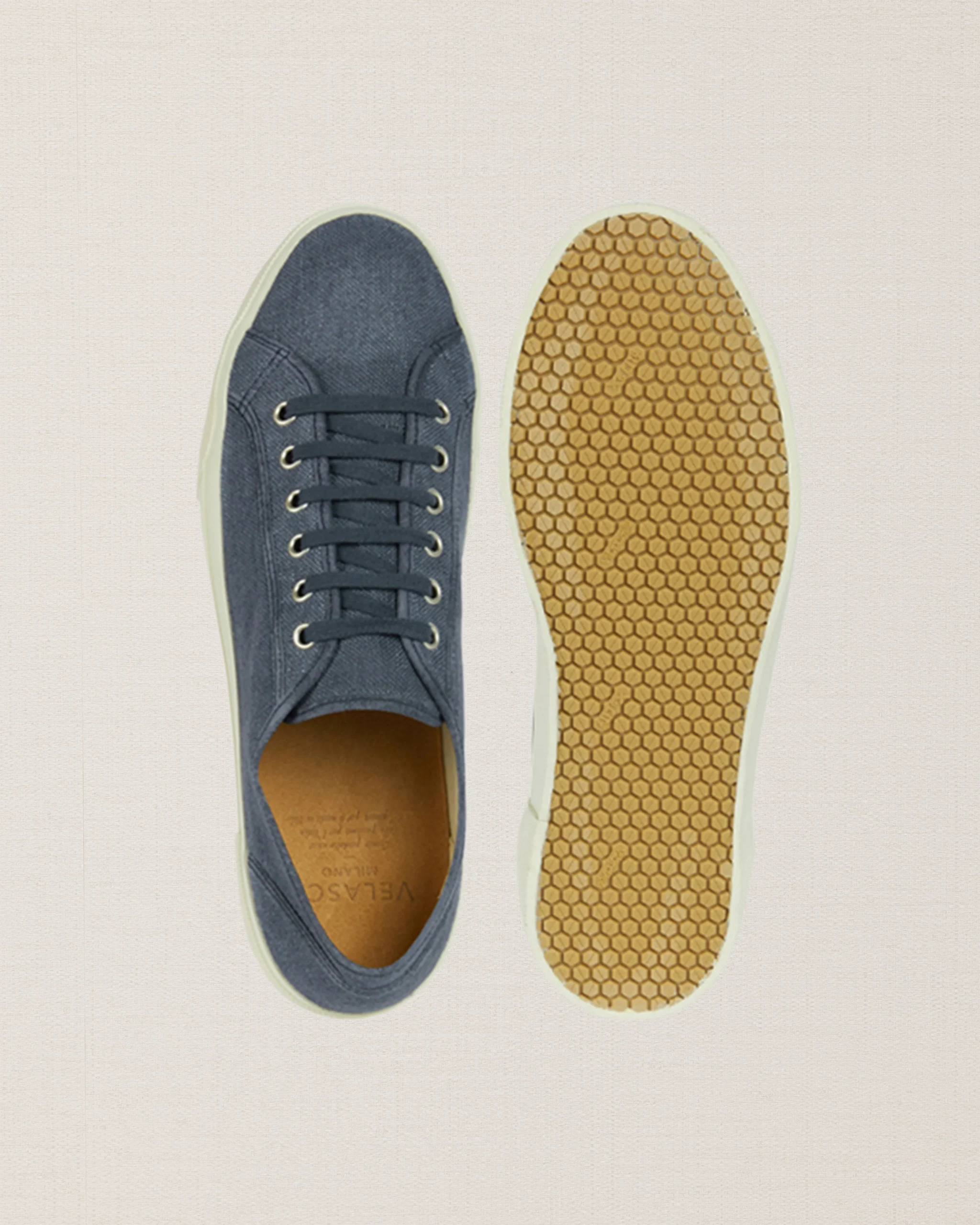 Le nostre Sneakers artigianali dall’anima vintage, in lino blu. La suola è composta da una fascia in gomma, che avvolge e unisce la suola Vibram alla tomaia in lino. L’estate aspetta, le calze non sono invitate.