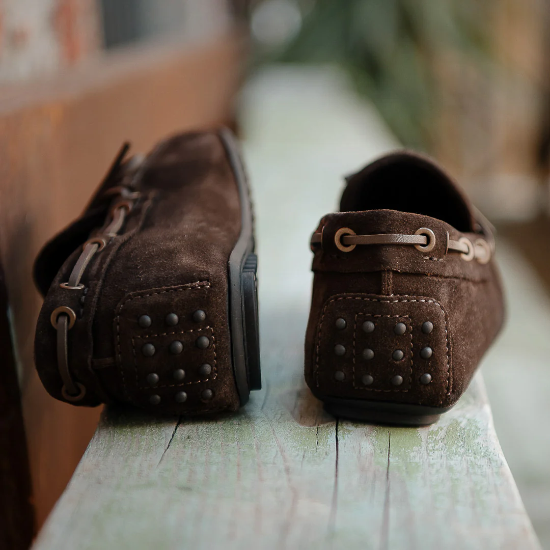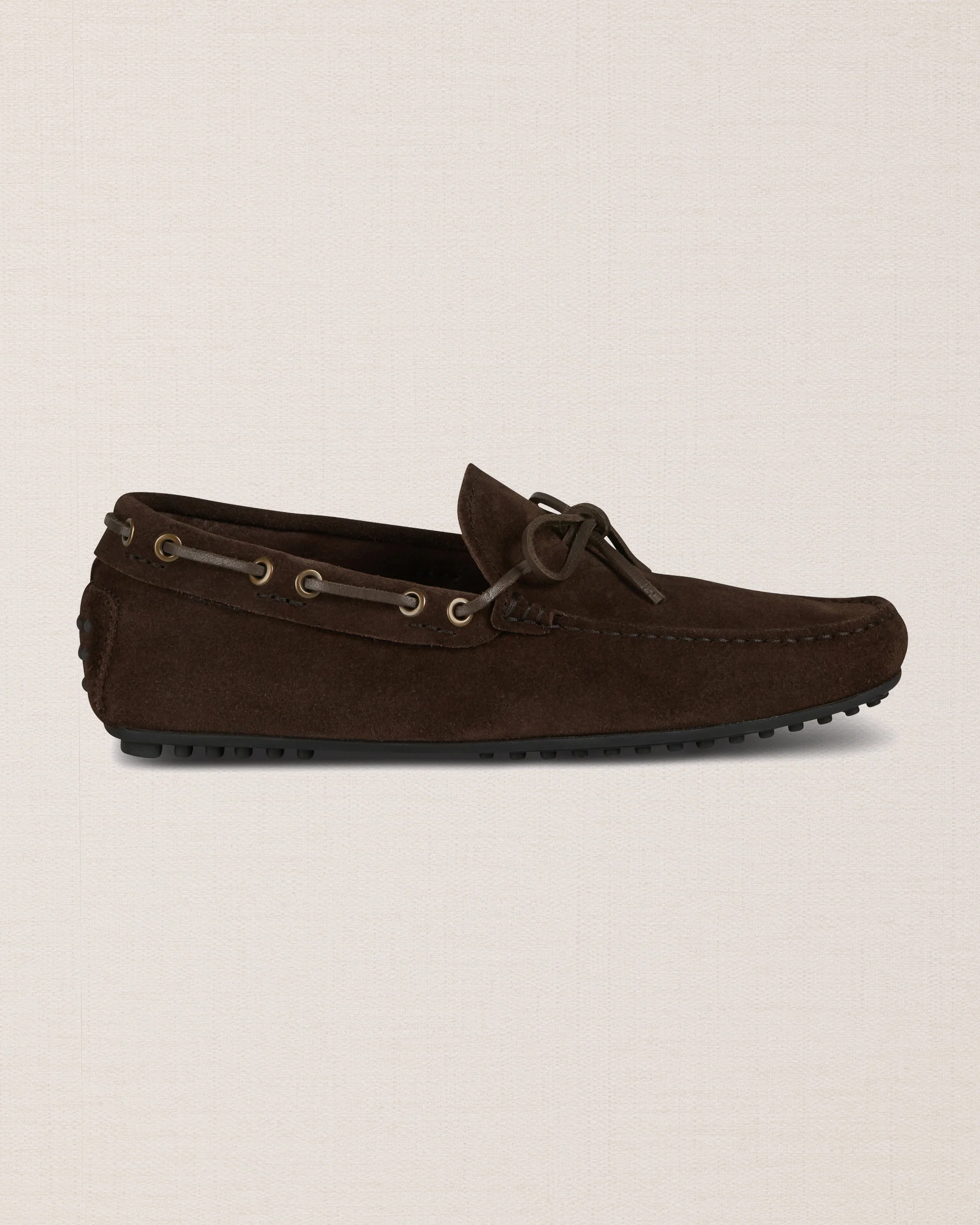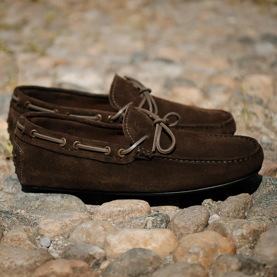 Non è il classico mocassino con gommini. Qui la suola in gomma copre la lunghezza di tutta la scarpa, conferendo una certa solidità. Gli abbiamo dato un’anima nuova, ma le sue linee restano iconiche: i laccetti avvolgono il piede e cadono disinvolti sulla tomaia. In pelle di vitello scamosciata, puoi indossarlo con un maglione girocollo blu con trecce, camicia oxford e un paio di jeans slavati. Sempre senza calze. Perfette da mettere nella tua weekender per le gite fuori porta quando l’aria inizia a scaldarsi.