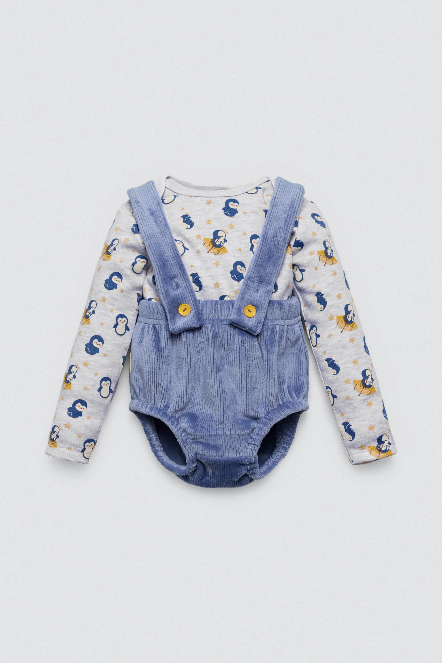 Set per neonato composto da tutina a maniche lunghe con stampa a pinguino e salopette corta con bottoni. Interno in peluche e tessuto in cotone naturale. Ideale per la mezza stagione.