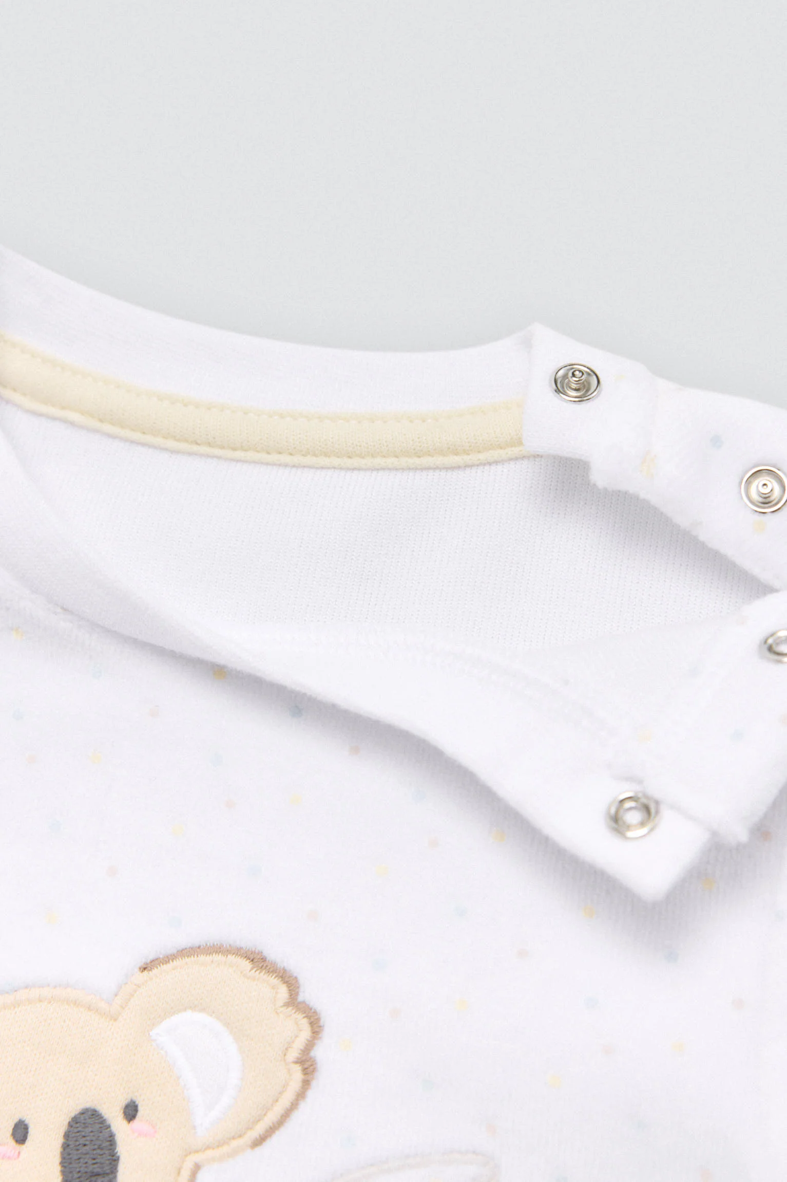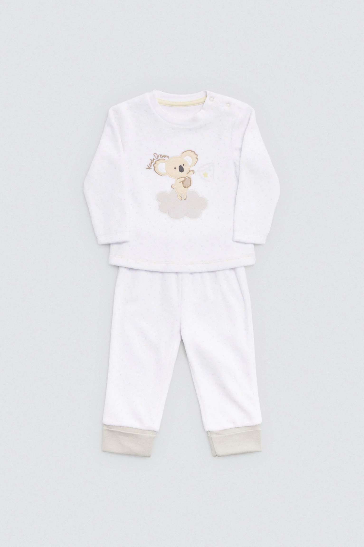 Set per neonato composto da maglietta a maniche lunghe e pantaloni con interno in peluche. Design a forma di koala in tonalità delicate. Realizzato in cotone naturale, è ideale per le giornate fredde grazie alla sua morbidezza e calore.