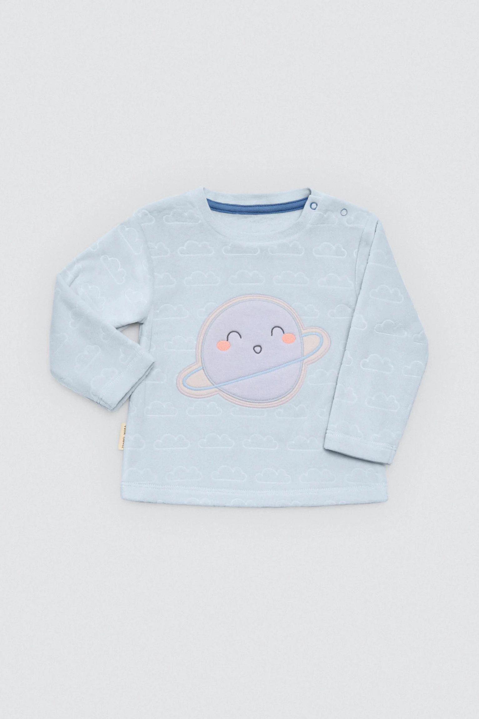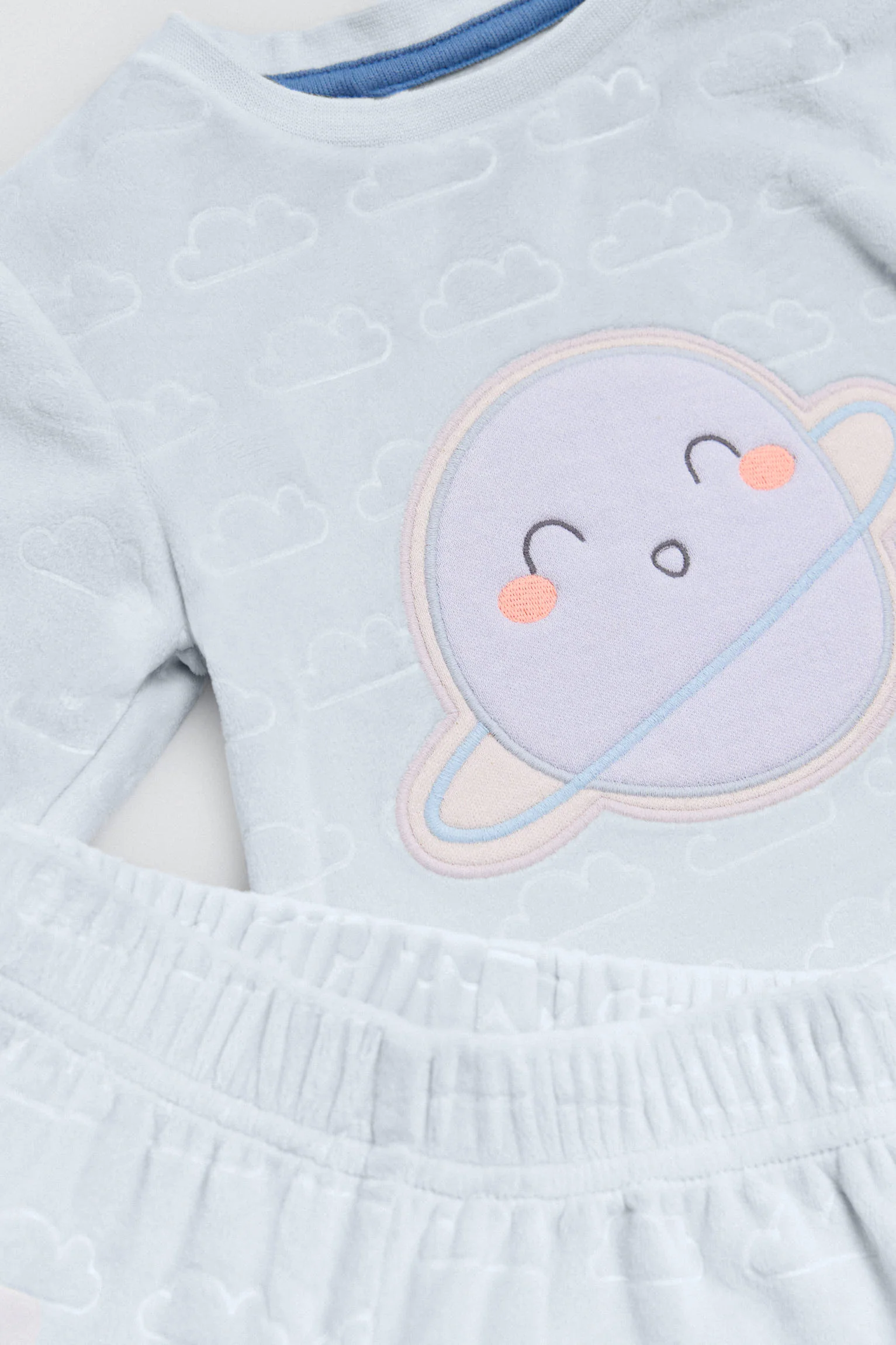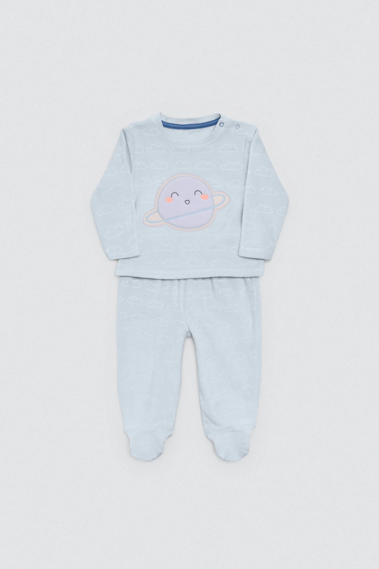 Set invernale per neonato composto da maglietta a maniche lunghe e leggings con interno in peluche. Stampa di pianeti e stelle. Cotone naturale per la massima morbidezza e comfort sulla pelle del bambino.