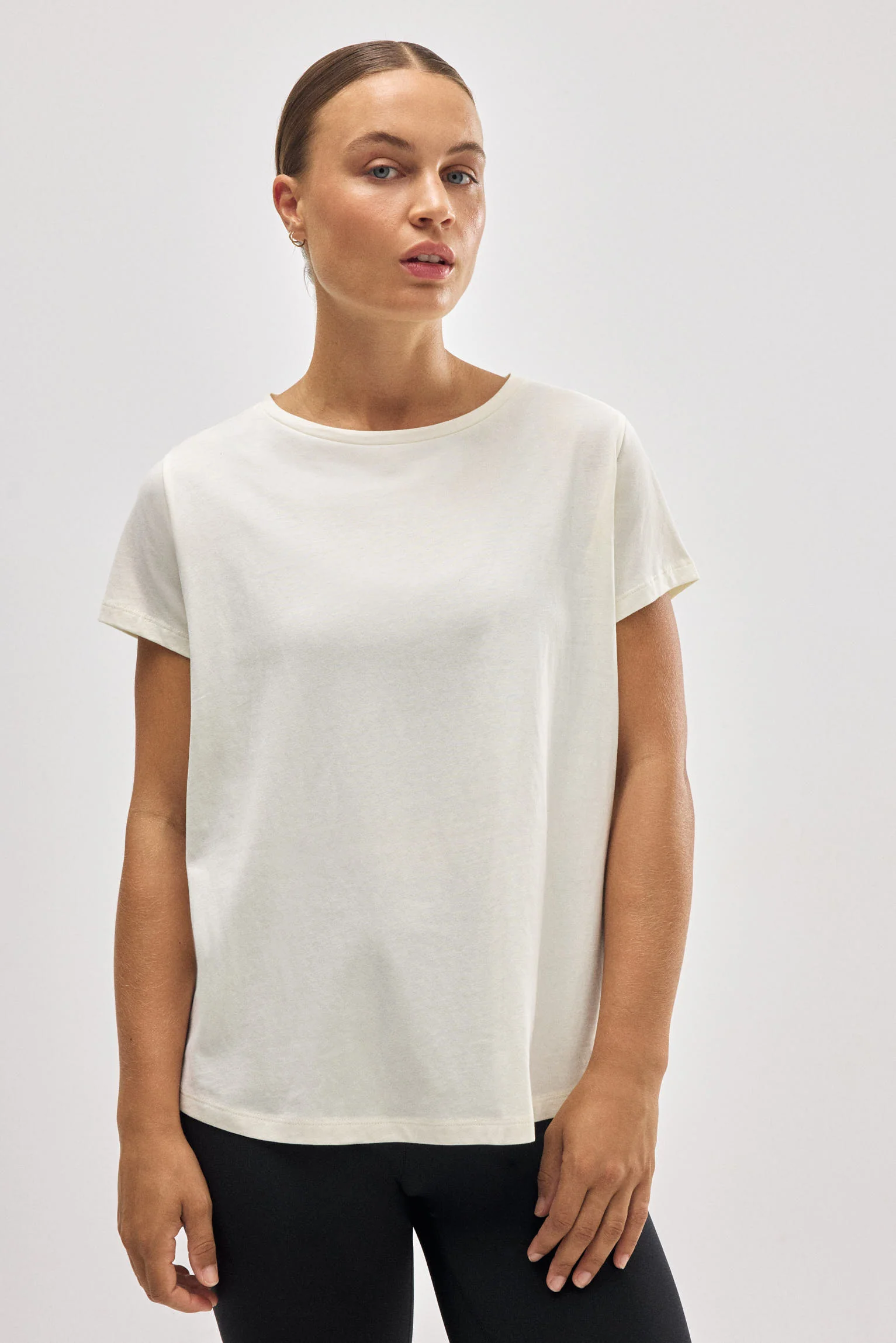 Questa t-shirt color avorio unisce stile minimalista e funzionalità per accompagnarti durante gli allenamenti e la vita di tutti i giorni. Il tessuto in cotone e la vestibilità comoda ti permettono di muoverti liberamente, senza rinunciare a un look pulito, naturale e raffinato. Perfetta da abbinare ai tuoi leggings preferiti.