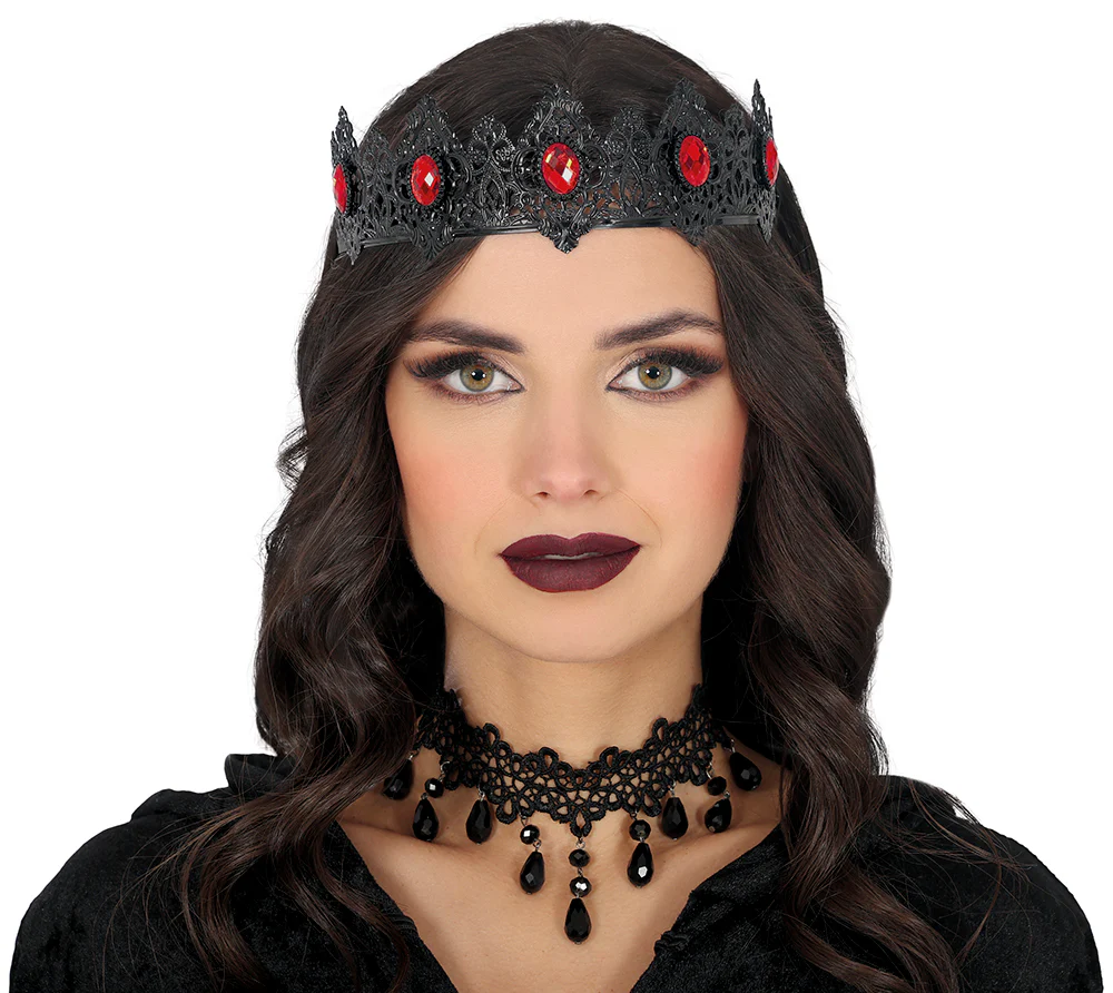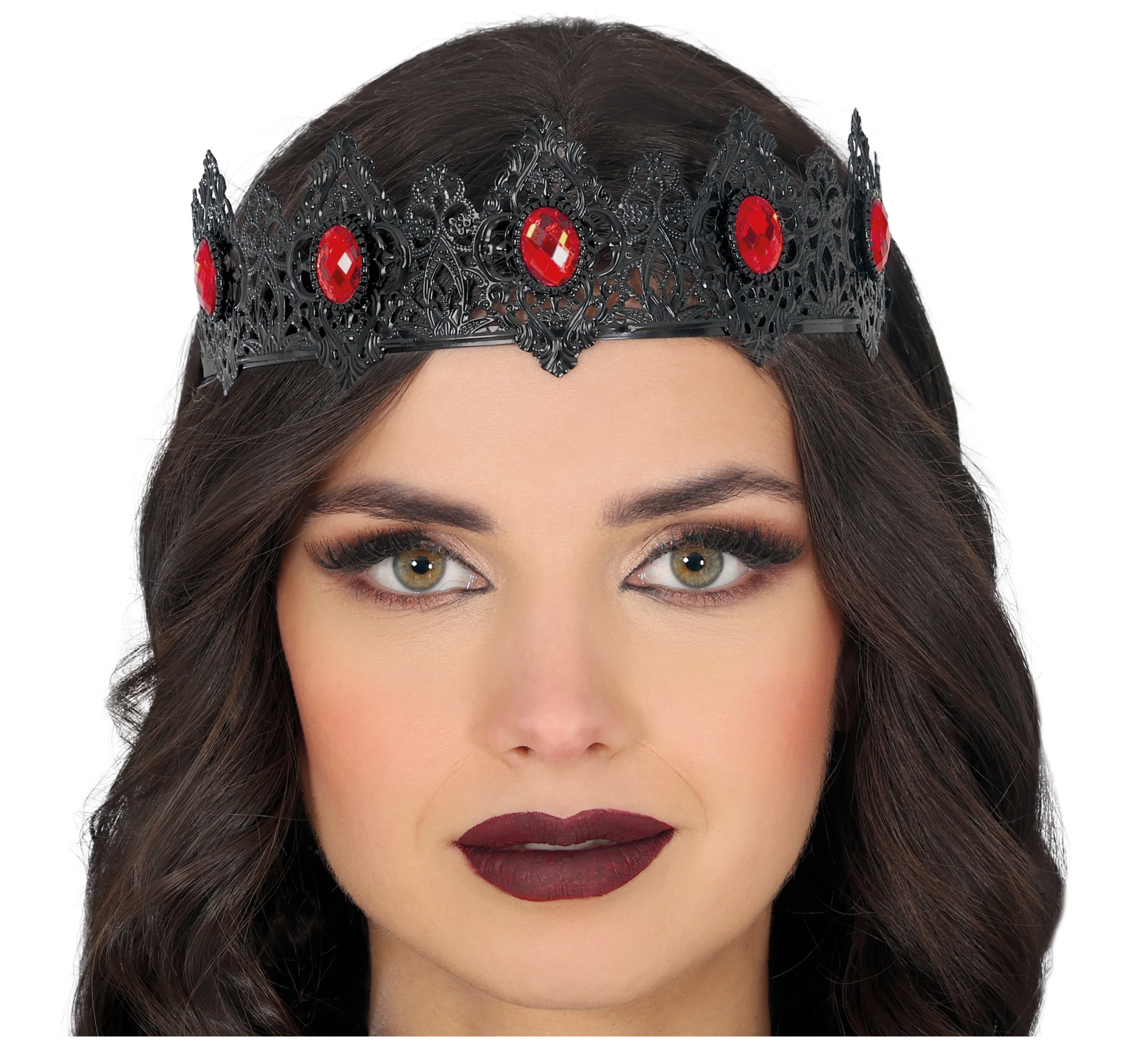 Stai cercando una corona per il tuo costume da regina cattiva? Con la tiara metallica nera con pietre preziose rosse avrai l’accessorio perfetto per il tuo costume da principessa o regina oscura e trionferai alla tua festa per la tua grande eleganza e stile.