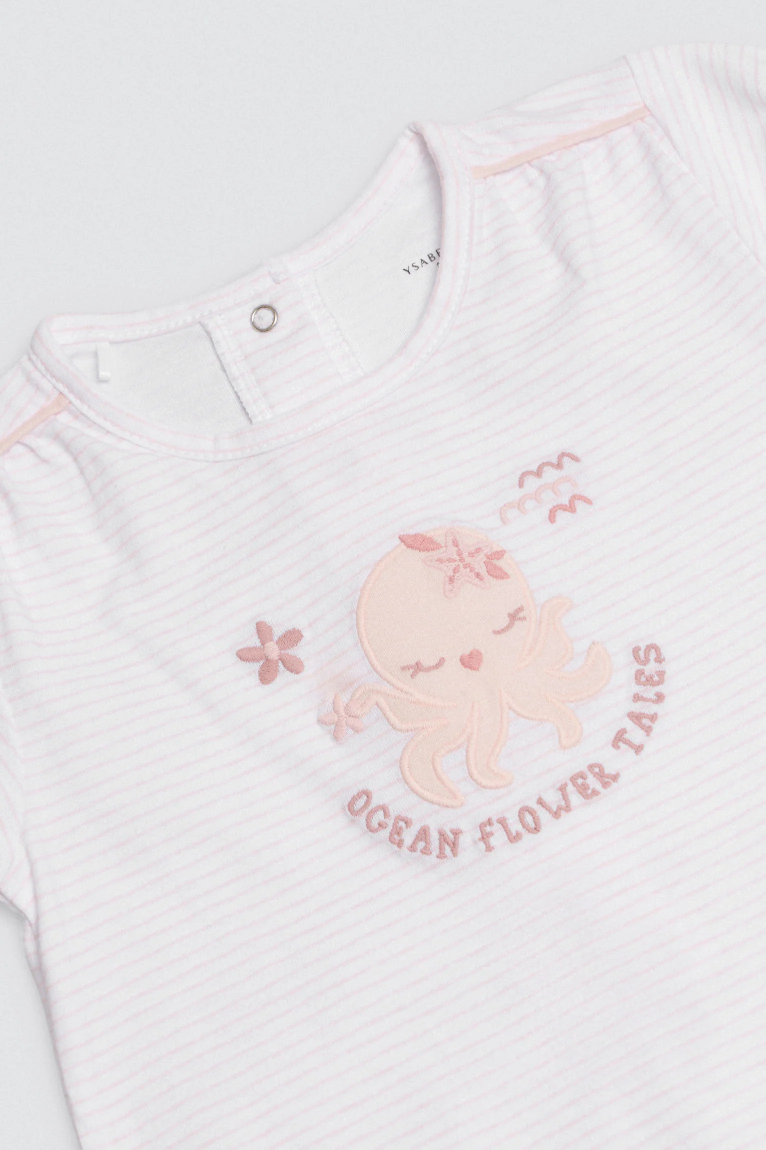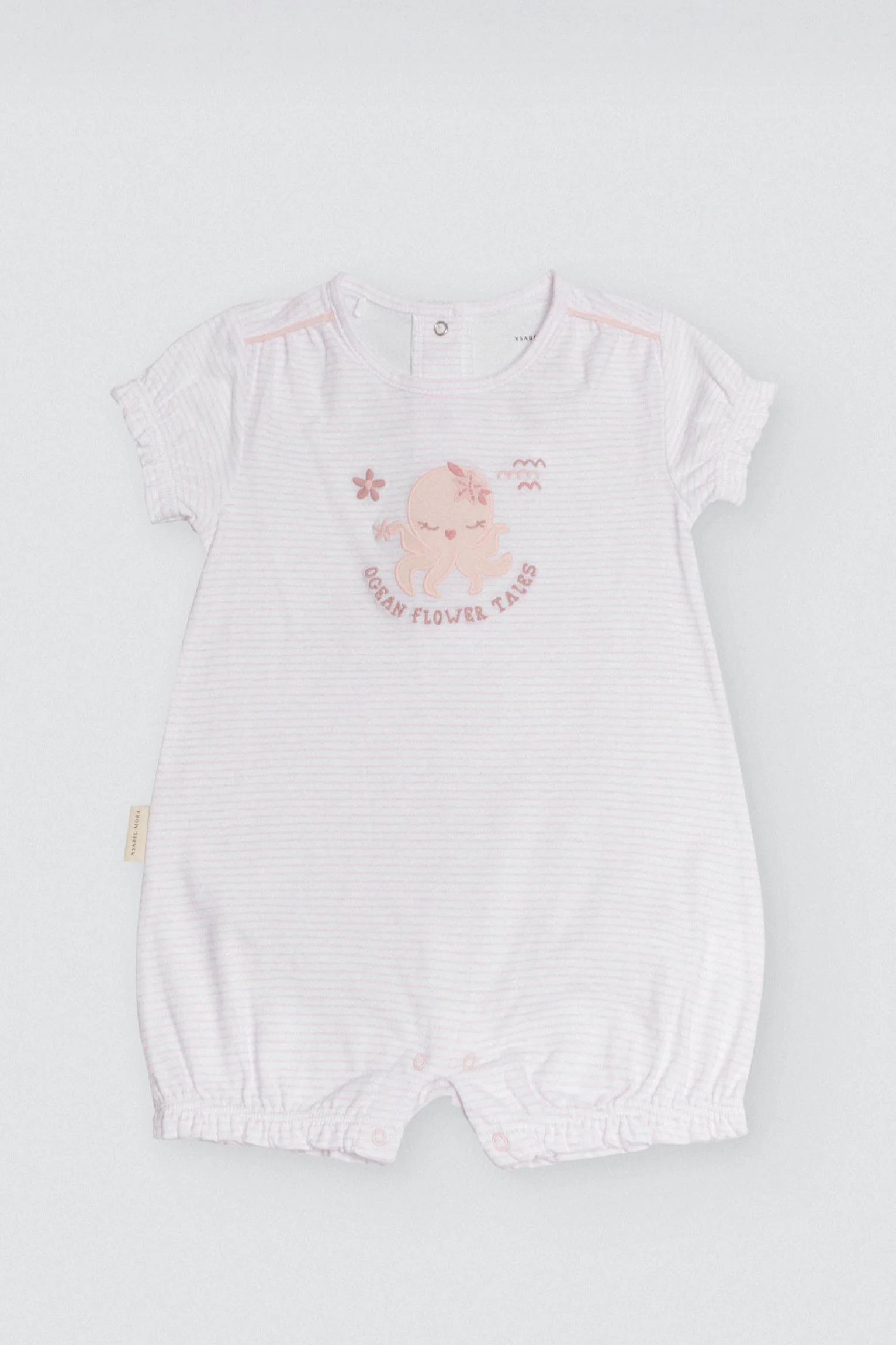 Tutina per bebè a maniche corte. L’unità è realizzata in cotone naturale al 100% in modo che i più piccoli possano divertirsi unendo comfort e stile. Tessitura fine e morbida con stampa a righe e figura di un polpo al centro davanti. Con bottoni a pressione sul retro.