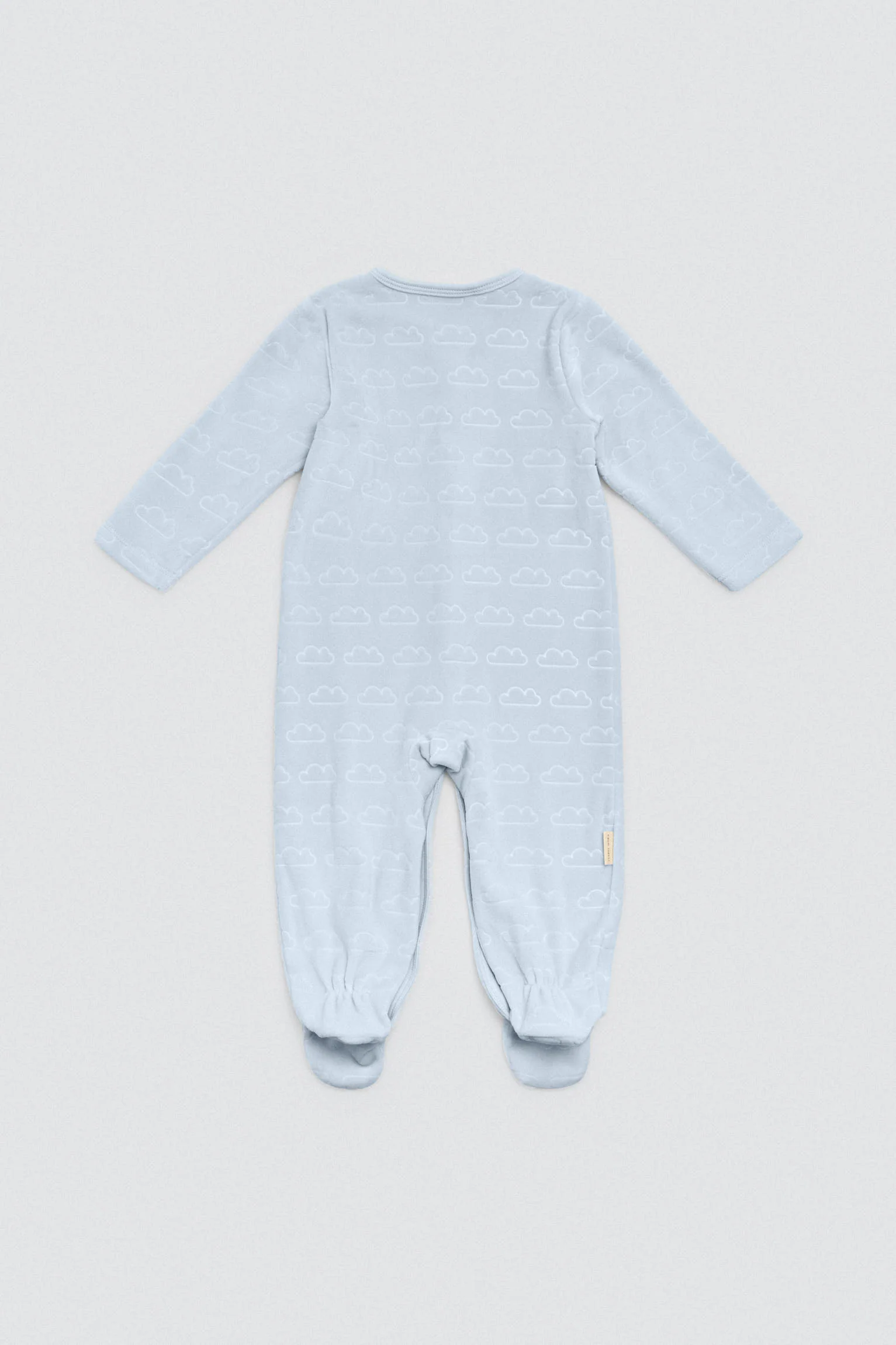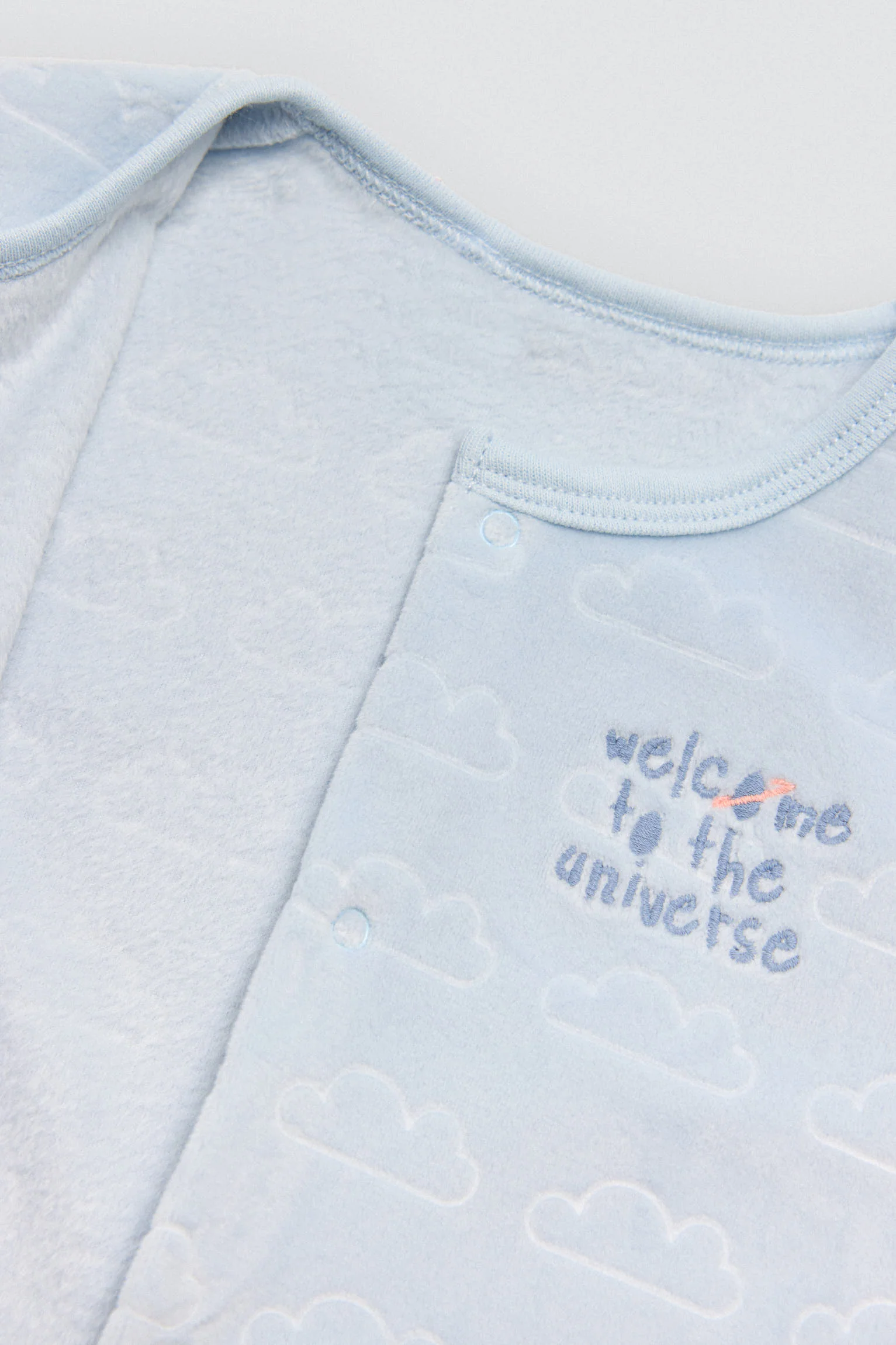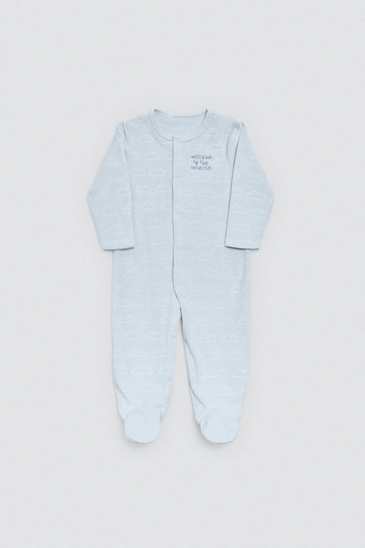 Pagliaccetto a maniche lunghe per neonati con interno in peluche e piedini chiusi. Soletta in silicone antiscivolo per una maggiore sicurezza. Chiusura con cerniera per un cambio facile. Stampa di pianeti e stelle.