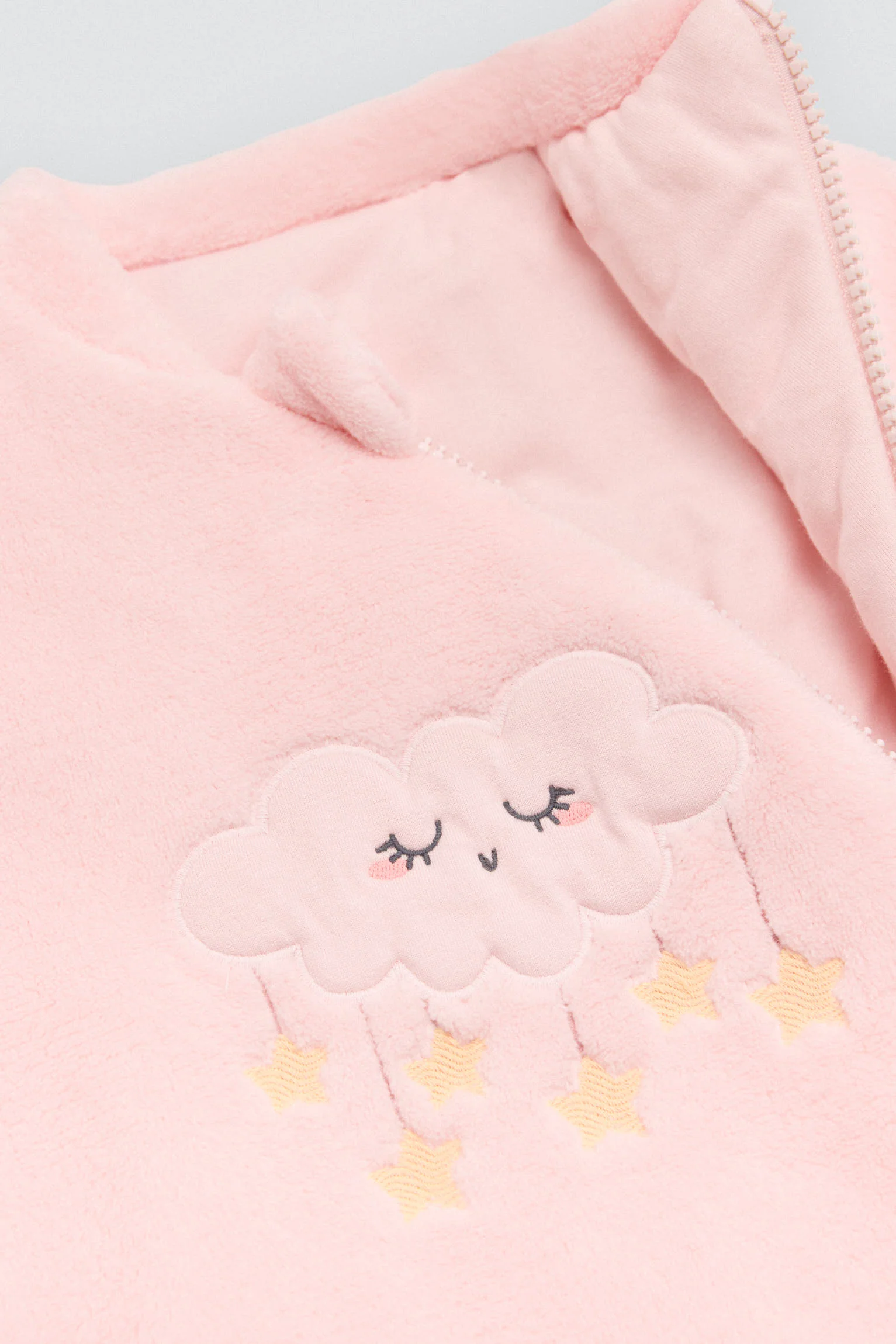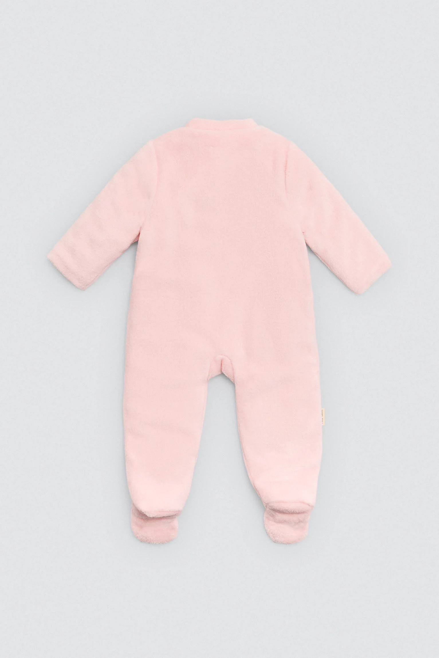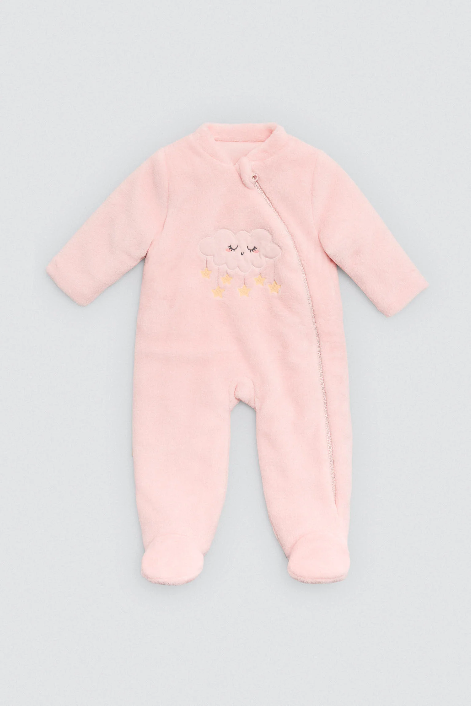 Tutina invernale rosa per neonati con interno in peluche. Presenta cappuccio, cerniera frontale e motivo a stella. Un cappotto completo per le giornate fredde, pensato per facilitare il cambio d’abito.